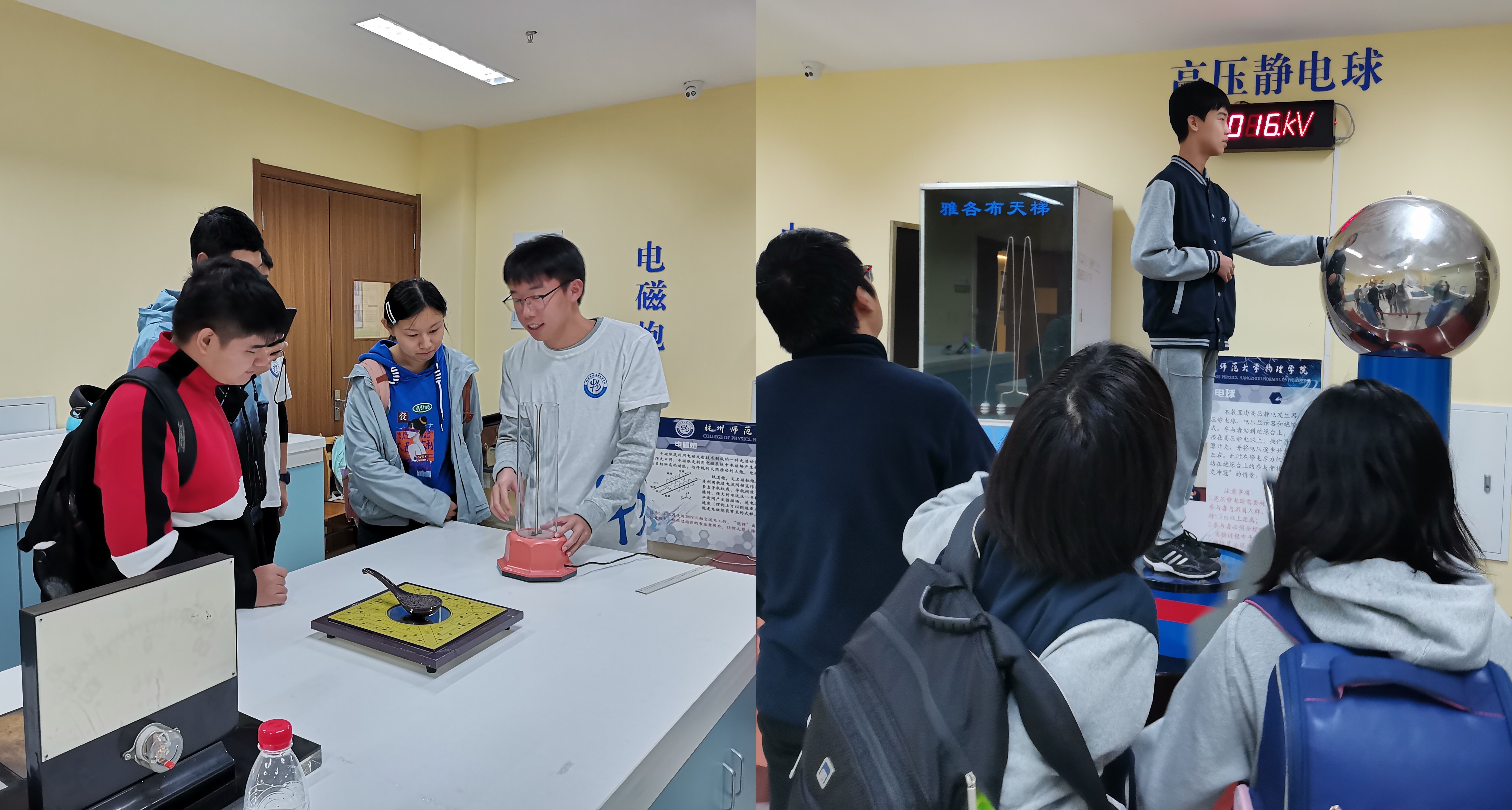 与此同时我们又迎来了校外的客人,他们是来自杭州云谷学校的师生一行20多人。志愿者们又忙活起来,耐心细致的讲解让中学生弟弟妹妹们感受到了真诚的科普服务。由杨金虎老师操作的高压静电球实验更是成为了“网红打卡地”,“快看,头发竖起来了,赶紧拍照做个表情包!”欢声笑语之间已在中学生们的心中播下了科技的种子。