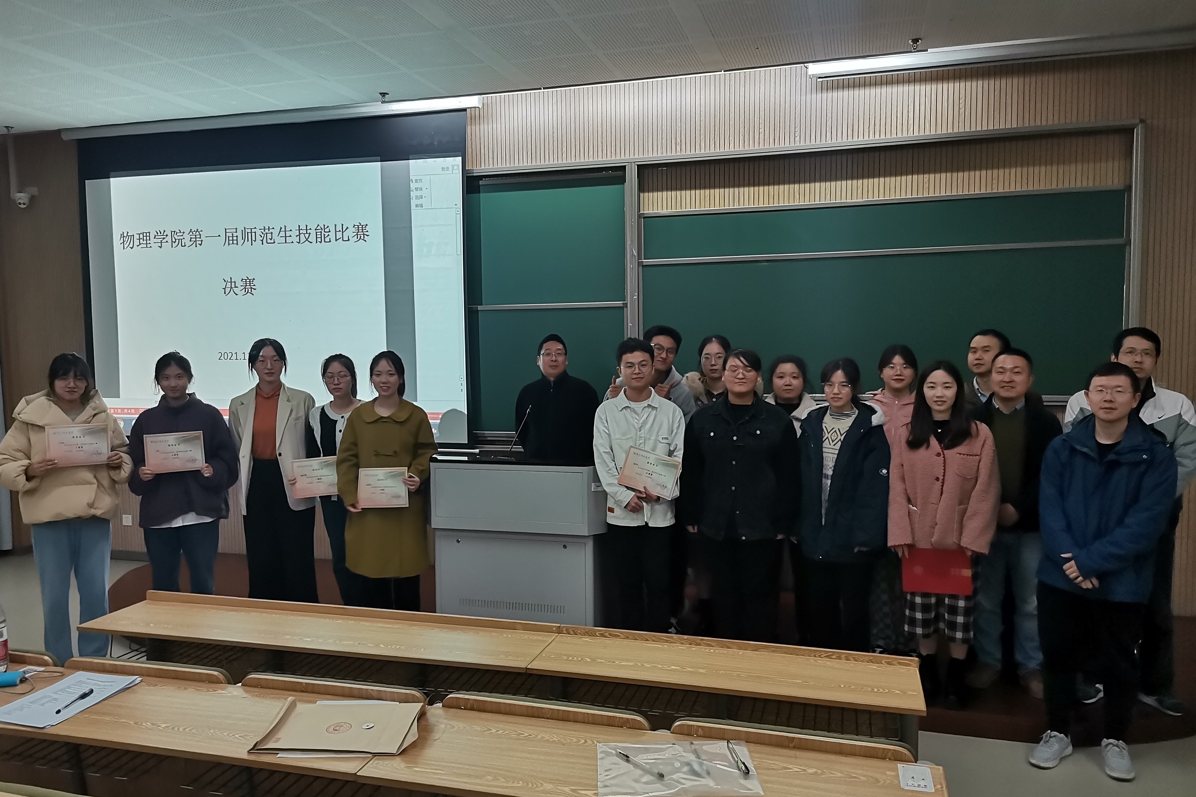 台上依次参赛的有来自物理191、192和科教191班的共14位选手,他们从参加初赛的50人中脱颖而出。台下评委席就座的是毛鸿老师、车宇老师、苏奇平老师,以及这三个班级的班主任杨金虎老师、叶余千老师和徐晓强老师。此外,三个班级的同学们都踊跃前来观赛学习。