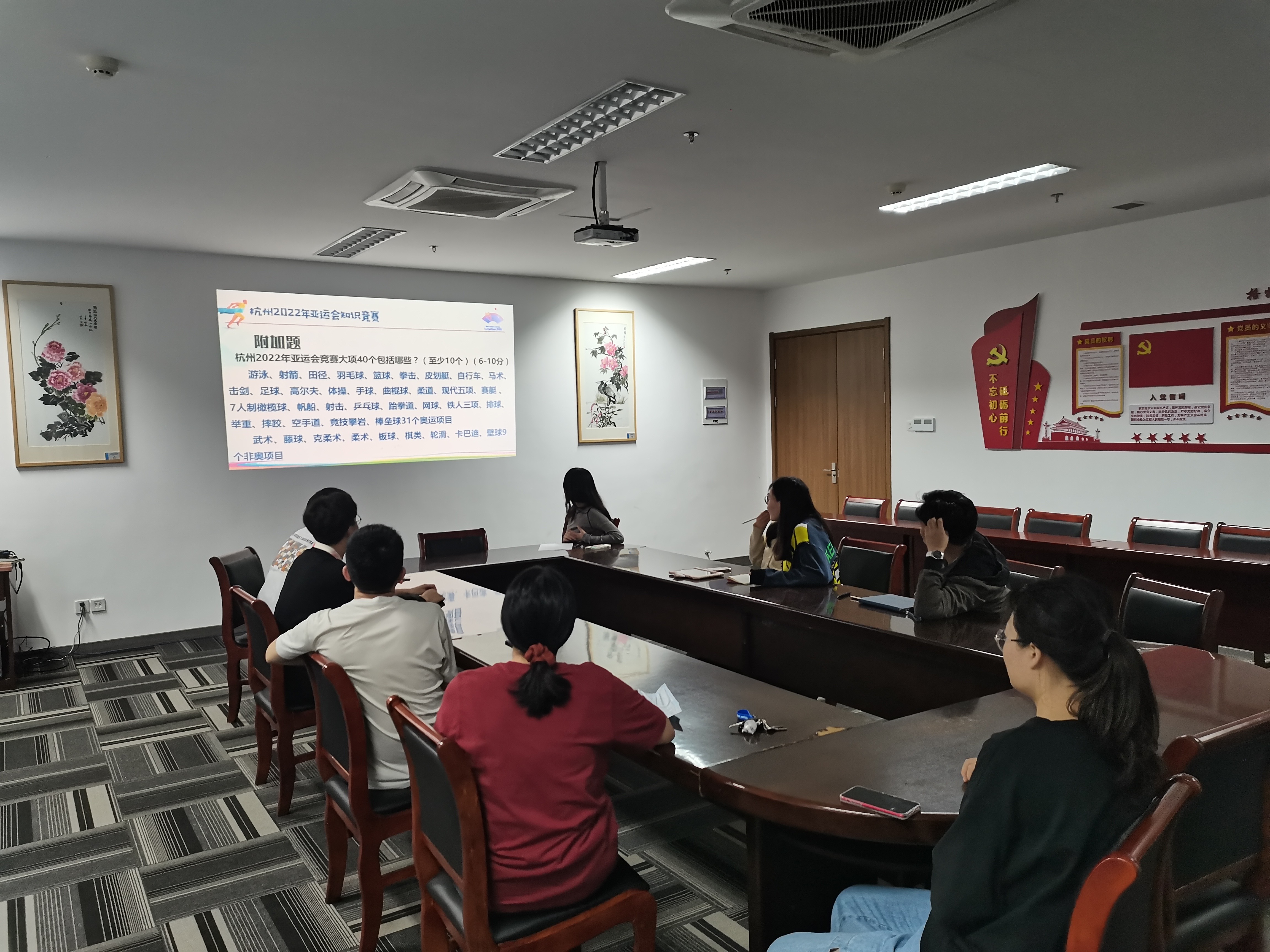 4月23日,大米影视 研究生第一党支部为了让支部党员更好地了解杭州亚运会,更深入地认识亚运精神,举办了“亚运会知识竞赛”主题党日活动。本次党日活动共分为三种题型,分别是填空题、简答题以及附加题,以抢答的形式进行,相比于之前的理论学习,大家的积极性得到了很大的提高,效果良好。