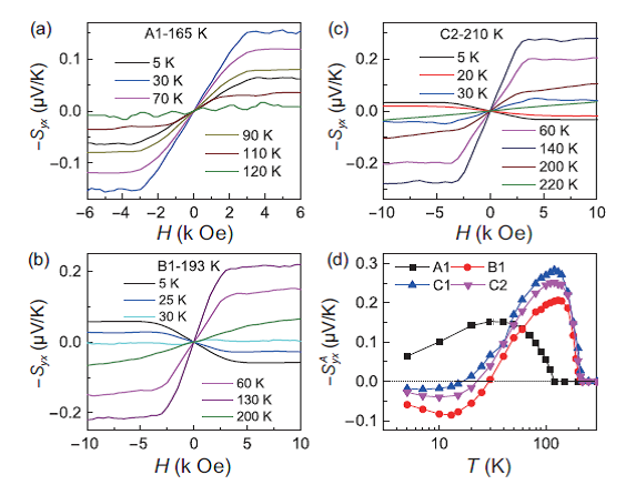 图:Fe3−δGeTe2体系的反常能斯特效应。(a)-(c)不同Fe含量Fe3−δGeTe2样品能斯特信号随磁场的依赖关系;(d) 不同Fe含量样品反常能斯特信号随温度的变化关系。