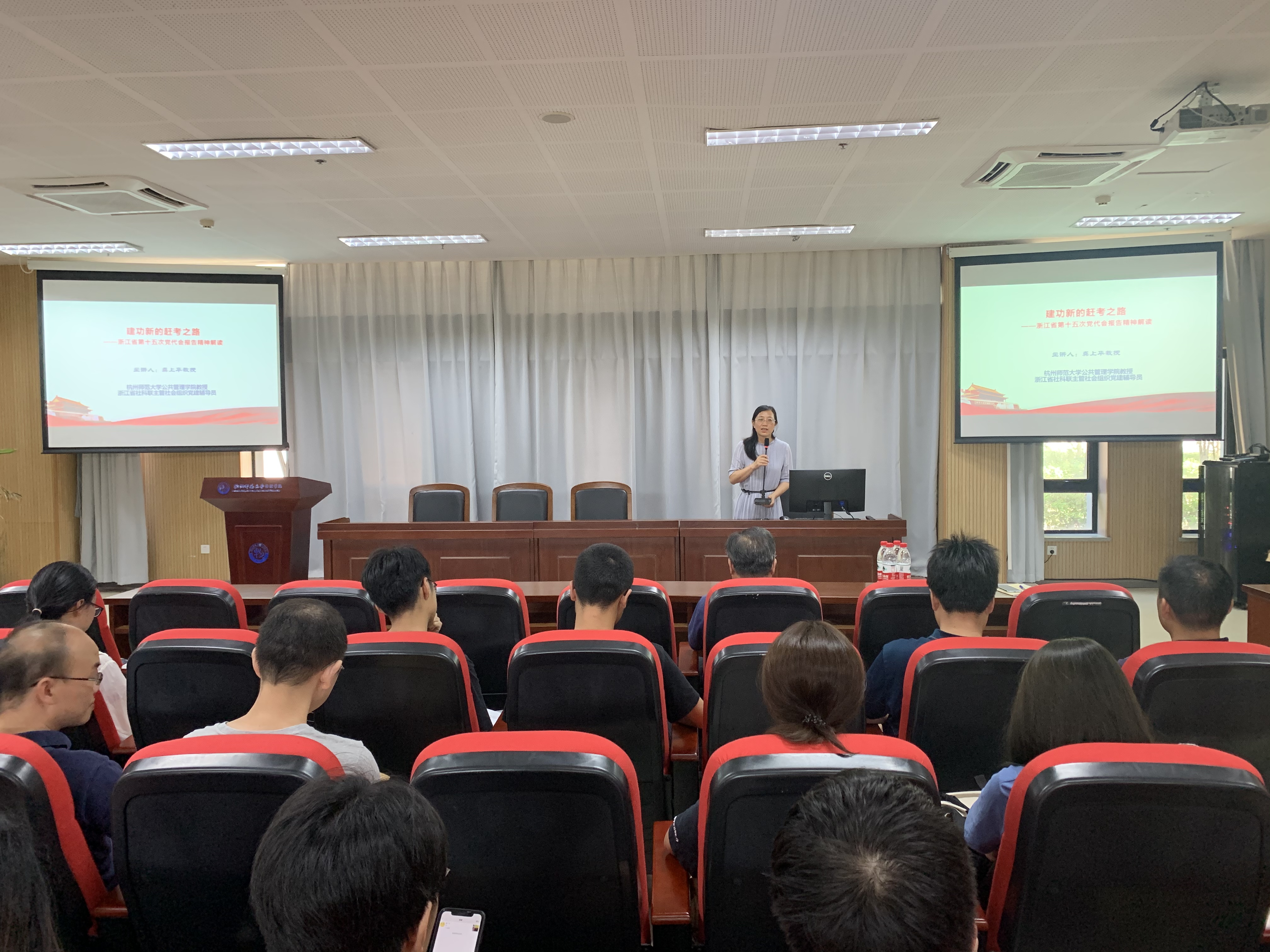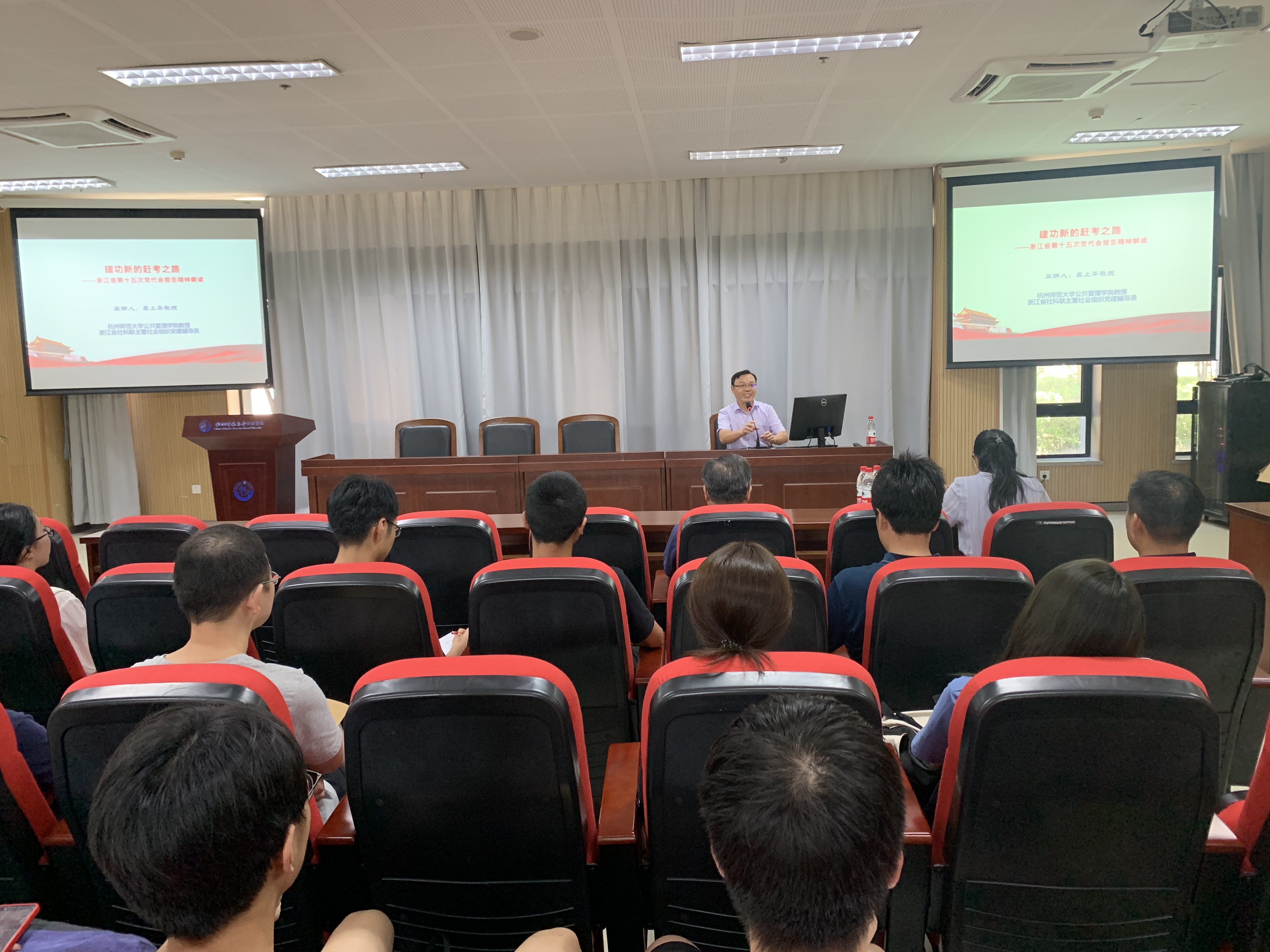 首先,浙江省社科联主管社团党建辅导员、大米影视 公共管理学院副院长龚上华教授以《建功新的赶考之路——浙江省第十五次党代会报告精神解读》为题,作了一次深刻的辅导报告。报告结合浙江省情与新世纪党代会省域定位,在回顾过去五年赶考成就的基础上,解码过去5年成功的“浙江密码”;更是以“28510”数字化、形象化地解读了未来五年的目标……始终紧扣“两个维护”、“两个大局”、“两个先行”三个关键词,指出唯有坚定不移沿着总书记指引的方向奋勇前进,才能闯出新路、不负使命。