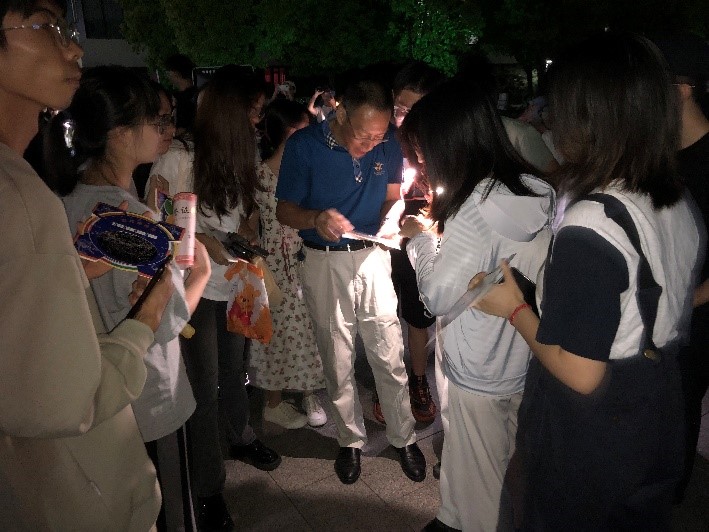 “夏季星空最为常见的是‘夏季大三角’,牛郎织女和天津四”,一位天文社员讲道。参与留言获得星图的同学们有模有样地研究起星空,而一旁“益起猜”支付宝公益科普问答时不时传来欢呼声,那便是有同学拿到了高分获得了最大的奖品,另外两台天文望远镜的身后同学们自发地排起了队伍,无论要等多久都想一睹“大玉盘”的芳容,相互之间拍照留念。