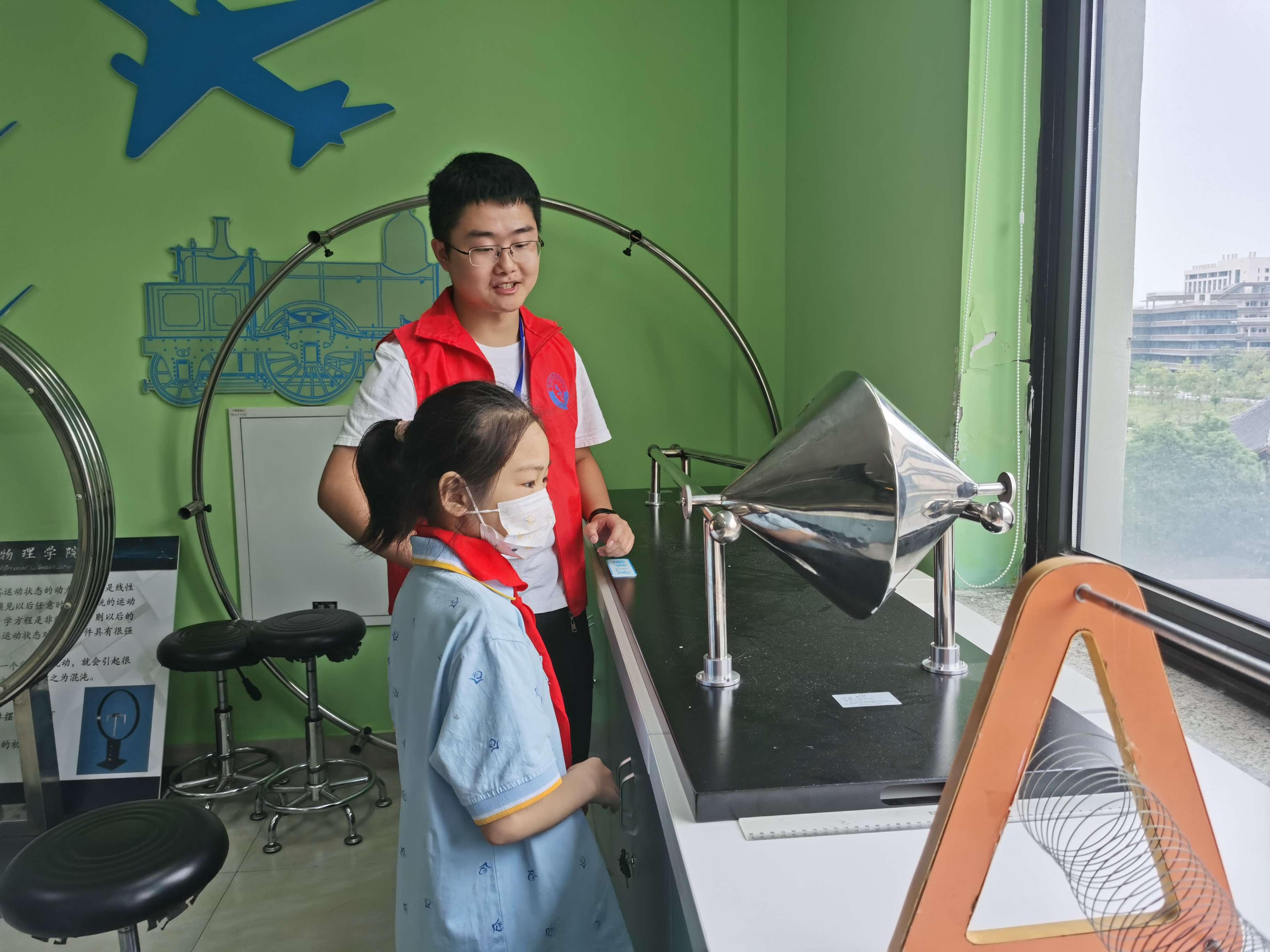 “铁球上的纸条怎么站立起来了?好神奇!”“为什么用手握住玻璃瓶子,里面会出现这么好看的喷泉?”……同学们在一件件科普展品前驻足观看,新奇的物理现象让同学们大开眼界,一双双清澈的眼眸中闪烁着渴求知识的光芒。此时在一旁的大学生科普志愿者们就微笑着打开了话匣子,用浅显易懂的语言解释现象背后的物理成因,鼓励并悉心指导同学们亲手操作实验仪器,亲身体验科学的魅力。