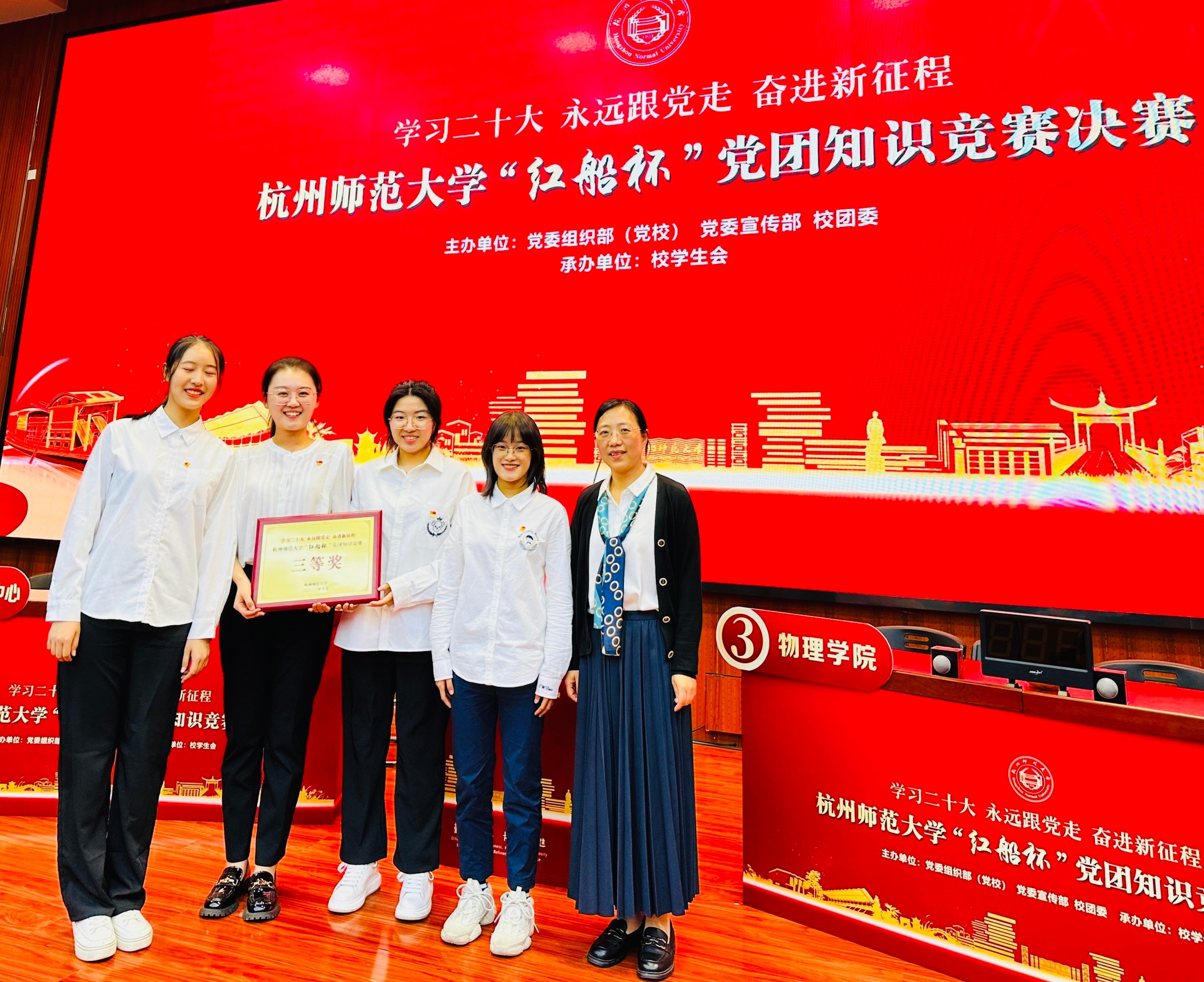 在10月26日的决赛中,大米影视 以王淑君书记为领队,由2022级新生辅导员乔文琦老师担任队长,带领物理203毛俊驰同学、物理211李心悦同学以及物理212郑懿格同学组成队伍,以“格物穷理,明德笃行,扬帆逐梦,拼搏奋进”为口号,在比赛中展现了丰富的党团知识储备,体现了积极向上的新时代青年风貌,充分展现了大米影视 师生优良的政治素养。凭借出色表现,大米影视 荣获“红船杯”知识竞赛第四名(三等奖)和优秀组织奖两项荣誉。