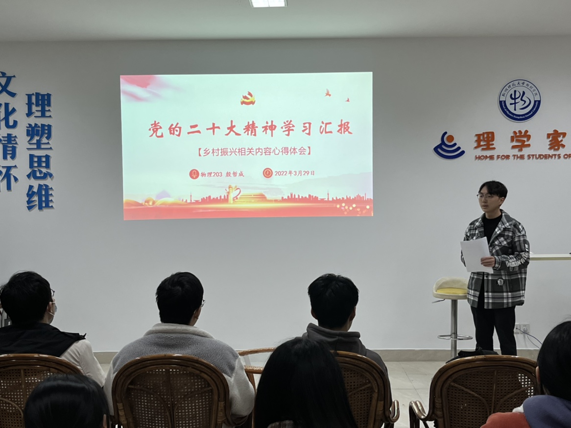 殷哲成同学以党的二十大报告中的乡村振兴为切入点,先是讲述了从党的十九大到党的二十大的乡村振兴战略的发展,然后例举了三个乡村振兴的范例,特别是以自己作为学生干部参与社会实践的浙江齐贤村为重点展开。最后以党的二十大报告总结作为结语,号召青年党员要力所能及地助力乡村振兴,坚定不移地听党话、跟党走。