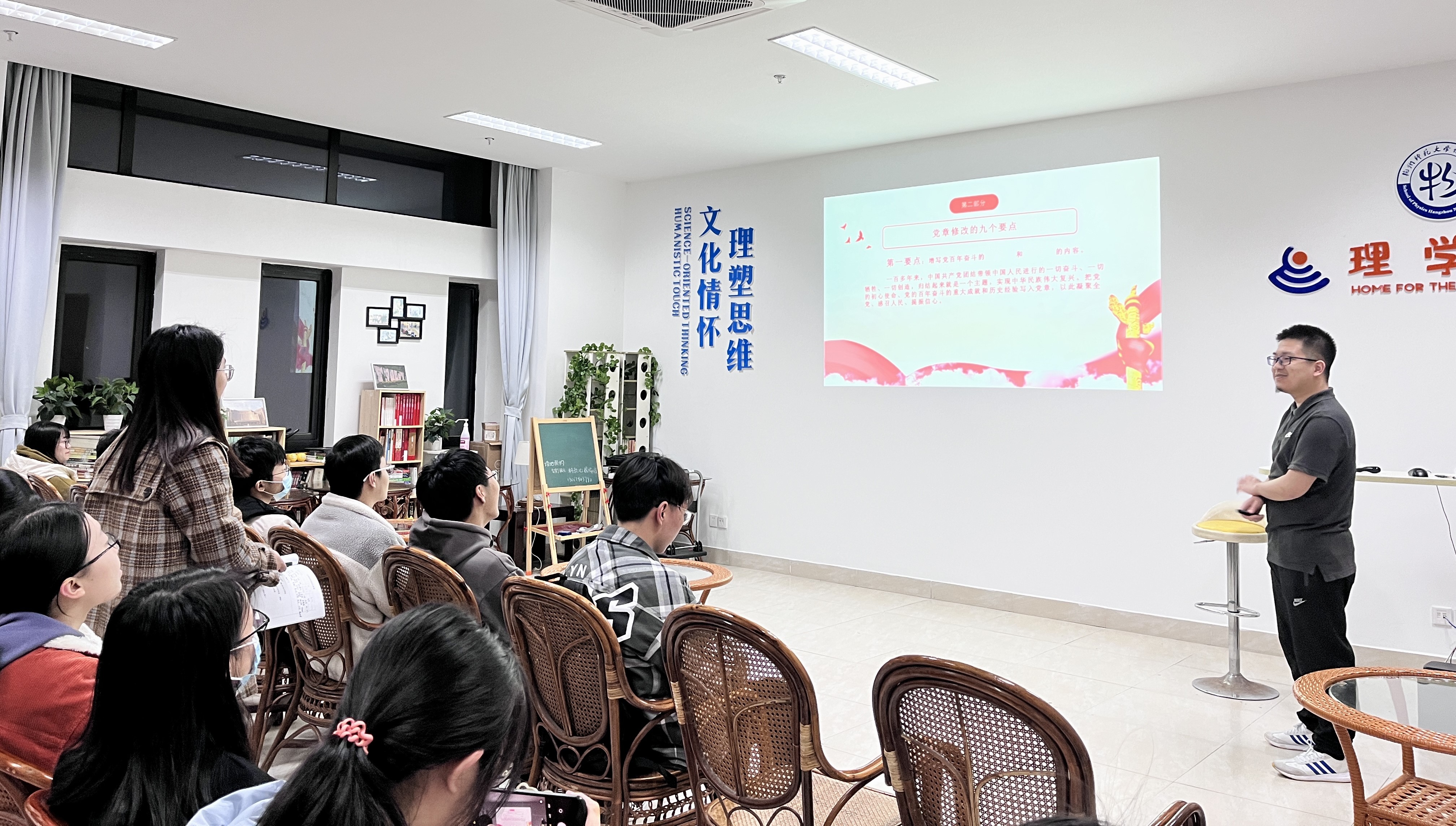 凌欣伟同学首先介绍了为什么要修改党章以及修改党章的意义。然后通过互动的形式让大家学习和理解党章修改的九个要点,让在座党员深刻把握党章改、变与不改、不变的规律,把党章的明文规定和贯穿党章始终的原则、精神学深悟透,真正加强自身的党性修养。