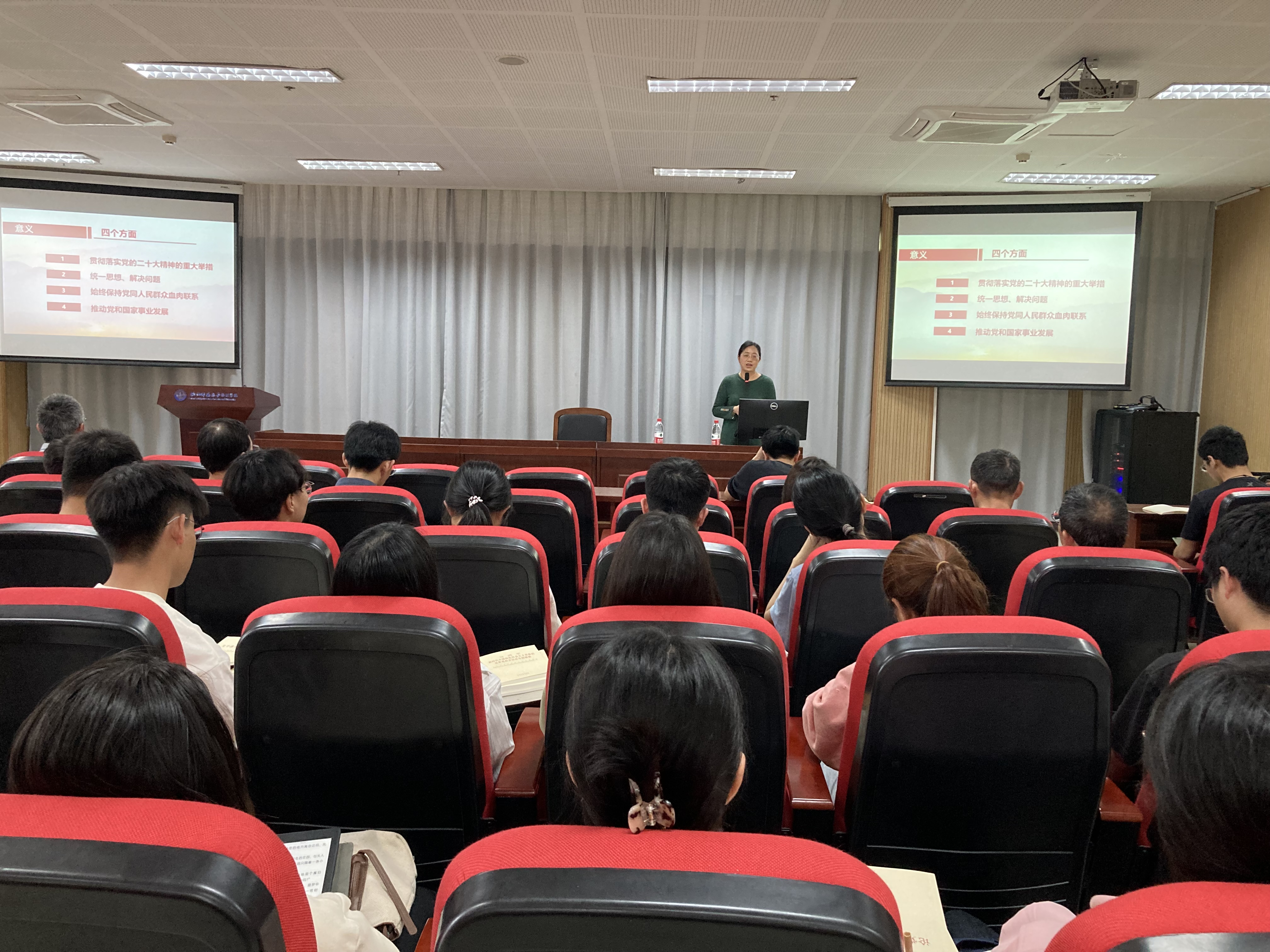 随后进行了第一次专题学习,邀请马克思主义学院党委副书记、纪委书记应维华老师,为全体党员做“以中国式现代化推进中华民族伟大复兴——中国共产党第二十次全国代表大会精神解读”专题报告。应老师从党的二十大召开的重大意义开讲,回顾中国崛起的这一百年,结合现在中国的局面,通过机遇和挑战、成因与成就、征程与领导、思想与实践等十组关键词,梳理了党的百年征程。通过讲解中国特色社会主义、守正创新、建党精神、中国式现代化等核心词汇,生动细腻地展现了新时代的伟大变革。
