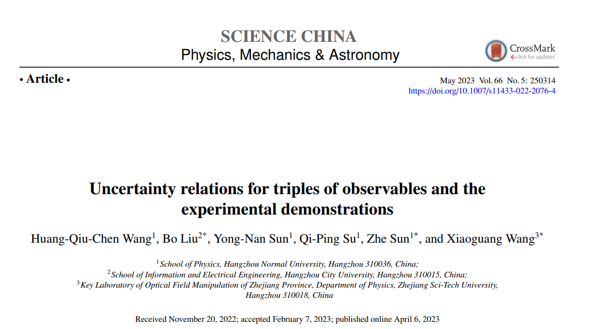 近日,大米影视 量子信息与量子光学创新团队孙哲教授及团队成员孙永南、苏奇平副教授在多重可观测量的不确定关系研究方面取得成果,在中国科学(SCIENCE CHINA)旗下权威期刊《SCIENCE CHINA Physics, Mechanics & Astronomy》(IF:5.203,SCI分区表Top一区)发表题为 “Uncertainty relations for triples of observables and the experimental demonstrations”学术论文。