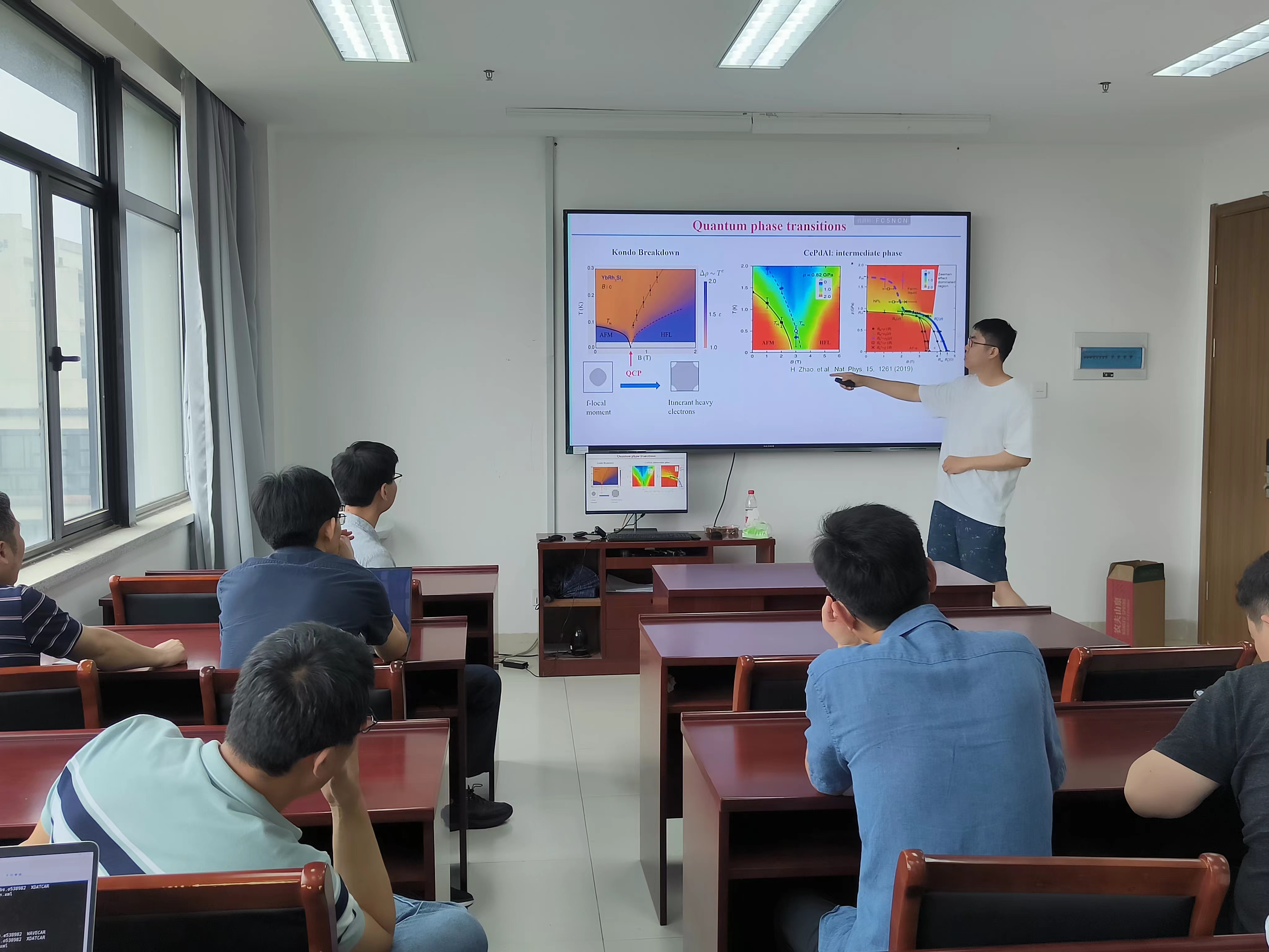 王江帆老师在报告中深入阐释了“非局域近藤效应和二流体现象的严格可解模型”。他介绍了最近提出的一个严格可解的动量空间近藤-海森堡模型,其动量空间中局域的近藤项对应于坐标空间高度非局域的近藤散射。应用此模型不仅能够成功解释二流体现象,而且提供了一种新的f电子局域-巡游转变机制。