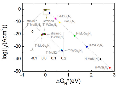 通过计算,发现畸变八面体相MA2Z4体系存在随晶格参数变化的半金属与金属性行文。同时,在畸变八面体相体系中,氢演化的自由能远比三棱柱相体系要低,部分结构更是具有接近理想零点的自由能大小。以MoGe2N4体系为例,其远比之前发现的MoS2体系具有更为优越的催化活性,其整个表面平面都可以催化活性点。同时,从催化火山图可见,各类畸变八面体相MA2Z4体系都可以调节具备优异的析氢反应催化活性。