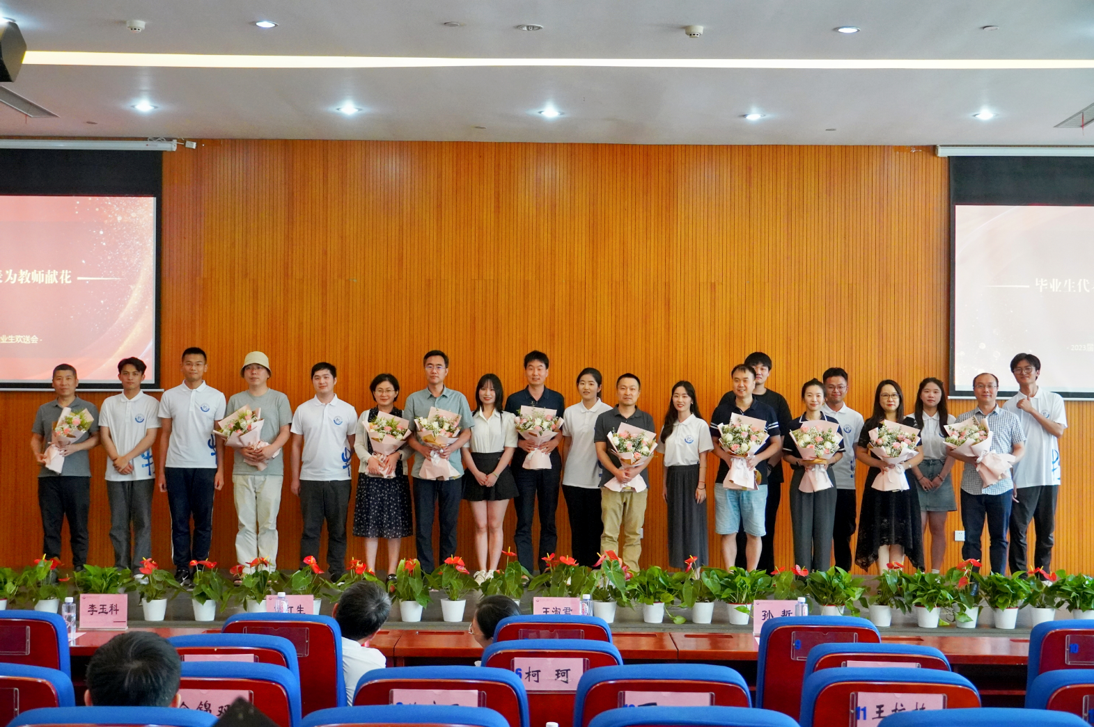 典礼伊始,全体起立奏唱国歌。随后,大米影视 副院长侯红生教授致辞,寄予同学们美好的祝愿,并给予同学们重要嘱托。接着,毕业生代表王黄秋辰赠与学院绘有“琼节凤枝”之雅趣的国画,借郑板桥之诗“新竹高于旧竹枝,全凭老干为扶持”,感恩学院老师的培育,并由大米影视 党委书记王淑君代表学院接受毕业生赠礼。随着现场音乐的响起,大米影视 副院长孙哲教授与学院党委委员兼院长助理李玉科教授为学院2023届校友联络员颁发了聘书。其后,毕业生代表科教191班鲁洁发表毕业感言,回顾了四年大学生活并对老师们的培养表达感谢,同时表示了对未来的憧憬;班主任代表科教191班主任徐晓强老师从同学们初入学时的青涩懵懂谈到现在同学们的成熟稳重,令人感慨,并勉励同学们不忘初心,继续前进。紧接着,各毕业班代表为班主任、导师以及辅导员献花。典礼上,科教191班王娟子、物理212班沈亦鑫、化学实验212班李福强三位同学倾情献唱《下一站茶山刘》和《入海》。最后,师生们共同观看了毕业视频和学院教师寄语视频,在老师们的真挚祝福中,2023届毕业生欢送会圆满结束。
