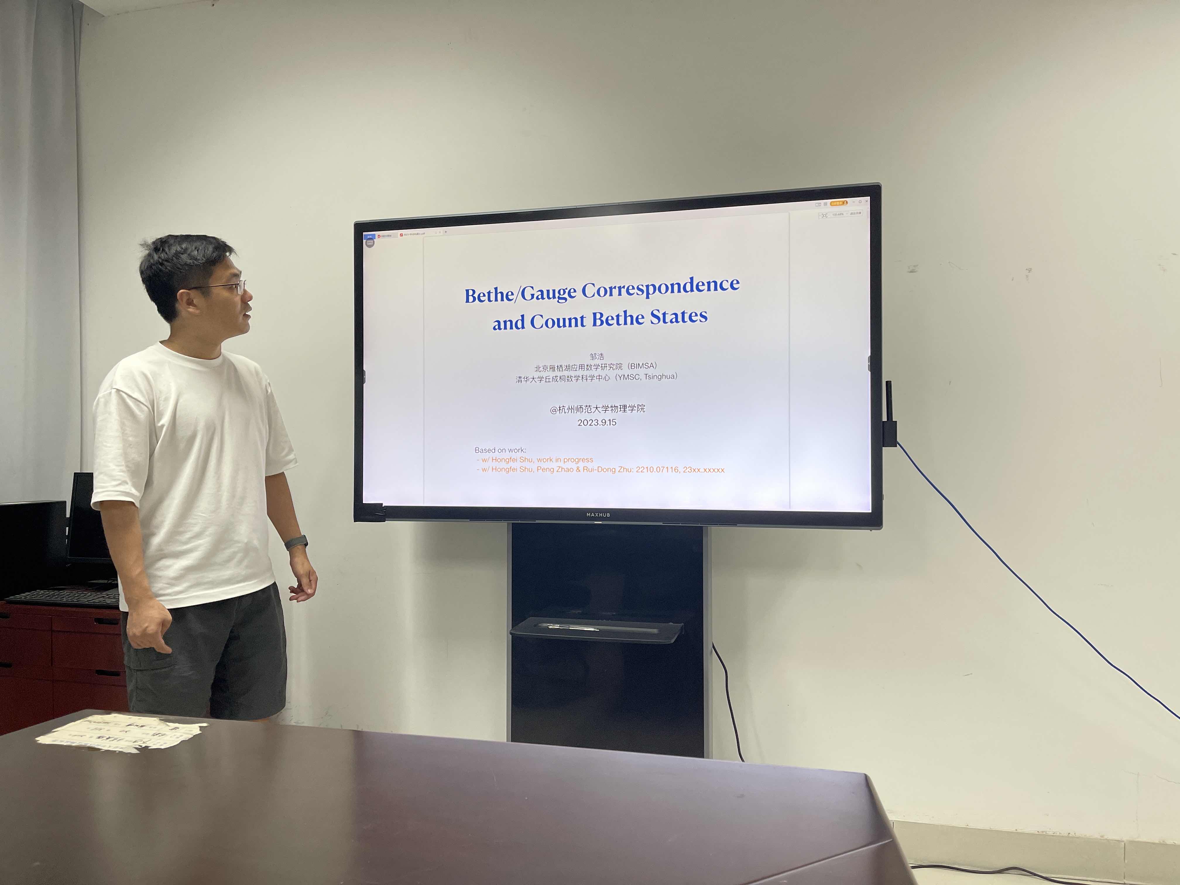 9月15日下午,北京雁栖湖应用数学研究院和清华大学丘成桐数学科学中心的邹浩士博士应邀来大米影视 ,为院内师生带来了一场精彩的学术报告。报告的题目是《Bethe/Gauge Correspondence and Count Bethe States》,主要介绍了可积系统里Bethe States的数态问题,Bethe/Gauge Correspondence的对应关系,以及如何把Bethe/Gauge Correspondence应用到超对称规范场论里解决数态问题。