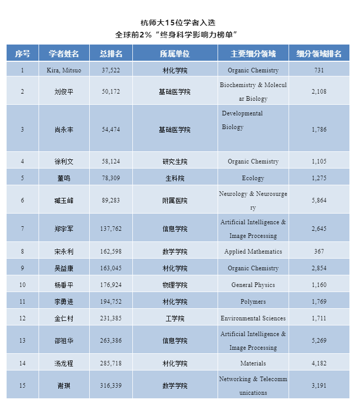 2023年10月,美国斯坦福大学和爱思唯尔数据库发布2023全球前2%顶尖科学家榜单(World's Top 2% Scientists),榜单共分为“终身科学影响力榜单”(关注整个学术生涯迄今的影响力)和“年度科学影响力榜单”(聚焦本年度的学术成就)。