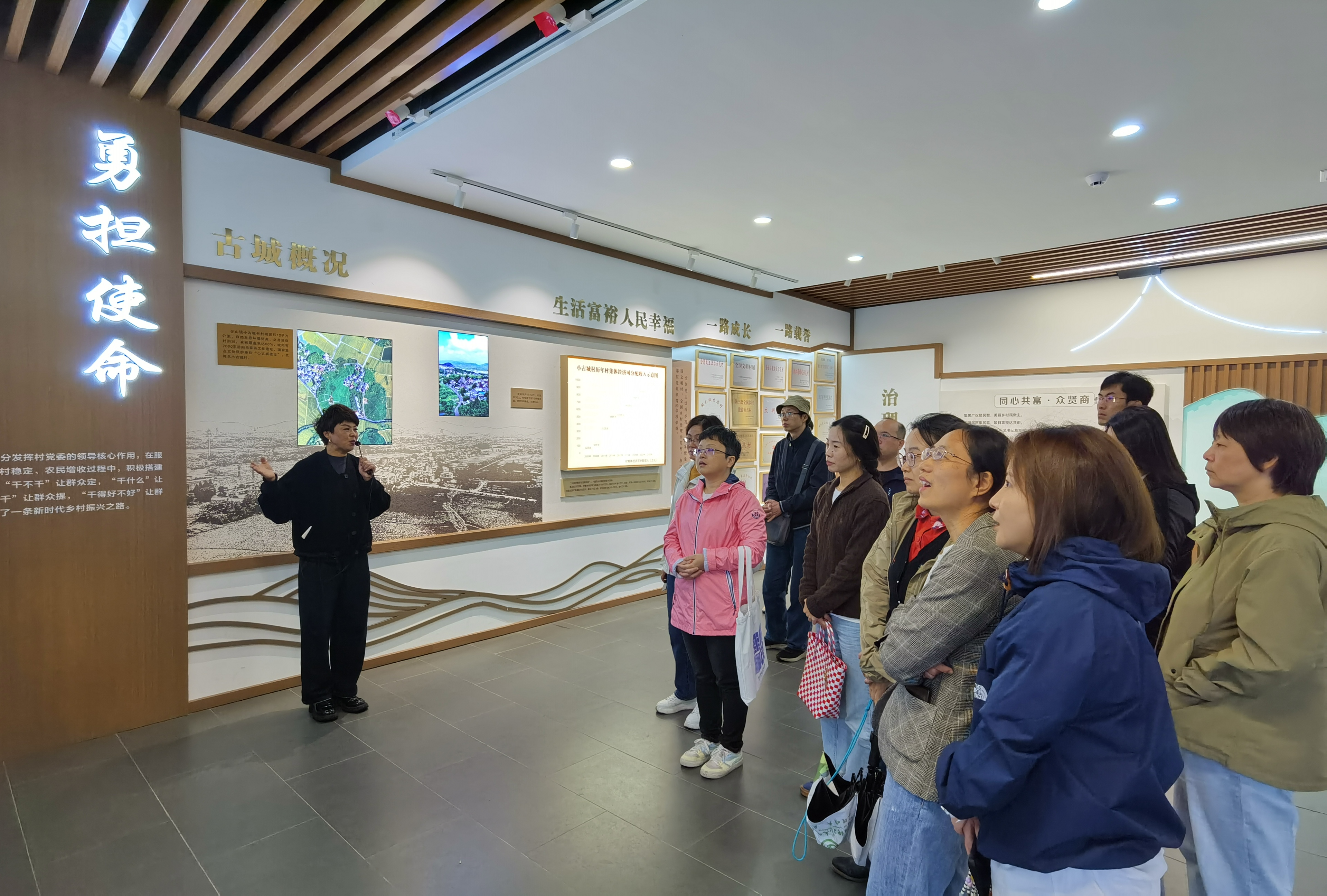 小古城村在打造美丽乡村实现共富路上,牢记习近平总书记“村里的事情大家商量着办”的殷殷嘱托,大力推进基层民主建设,取得了优秀的成绩,拥有全国民主法治示范村、全国文明村镇等几十项荣誉。大家在讲解员的带领下,参观了小古城村的民主协商展示馆,观看了习近平总书记调研时的新闻报道,和“众人的事情,由众人商量”的展示视频,仔细聆听讲解员介绍小古城村的建设经验。随后,大家跟着讲解员的脚步,参观了美丽乡村样板钱三组,沿着村间小道行走,两侧低矮围墙后的的民房整洁漂亮,屋前有共富邻售点,院子里有共享菜园,还有共享书屋“余阅书吧”,处处可以感受到村民们的幸福生活。