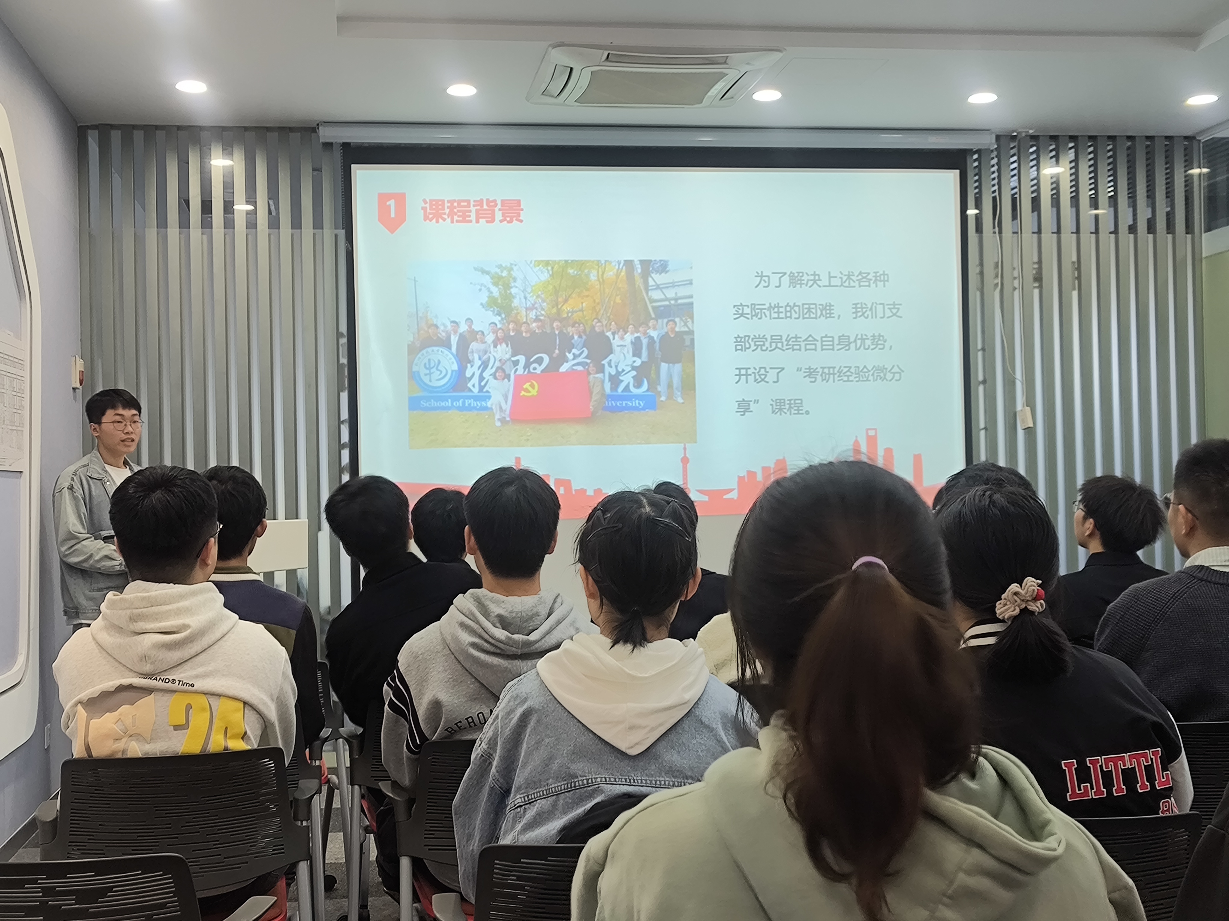 活动由支部书记李子豪主持,他首先对开展“考研经验微分享”课程的背景和意义进行了介绍,主要是旨在为本科生同学更好地考研服务,分享了活动开展形式,对课程的6个主题进行了简要的介绍,并总结了活动开展以来的成果。随后,由主讲过“考研经验微分享”课程赵华金进行课程展示,让支部党员对课程的内容提出建议,以便更好地完善课程,同时也是为新加入支部的新生党员做一次示范,为接下来她们加入这一活动做准备。课程展示结束之后,李子豪向支部党员介绍了支部特色活动的下一步安排,围绕物理学的各个学科专业方向进行专业剖析,帮助考研的同学更好的选择自己感兴趣的研究方向。最后,由李林勃同志进行关于凝聚态方向的介绍,并由全支部党员共同思考,提出相应的修改意见,为之后这个新活动的开展打下基础。