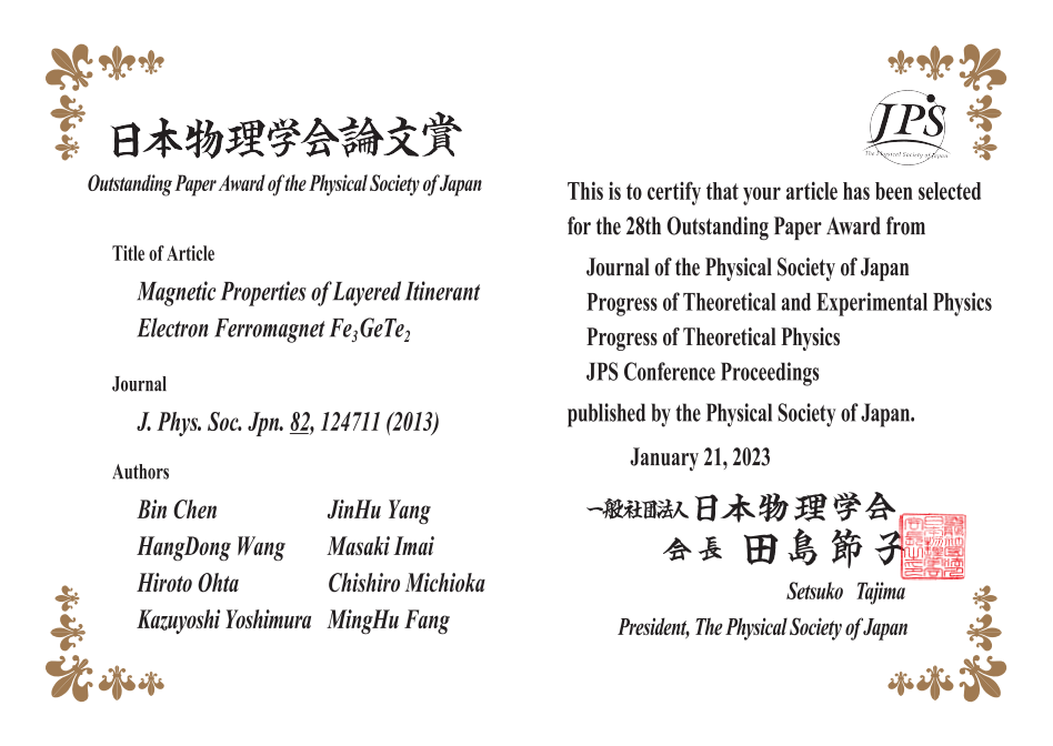 在最近结束的日本物理学会秋季会议中,大米影视 陈斌、杨金虎、王杭栋老师与浙江大学方明虎教授团队以及日本京都大学吉村一良教授团队共同发表的论文“Magnetic Properties of Layered Itinerant Electron Ferromagnet Fe3GeTe2”(J. Phys. Soc. Jpn. 82, 124711 (2013) 被引次数217)获得年度论文奖。