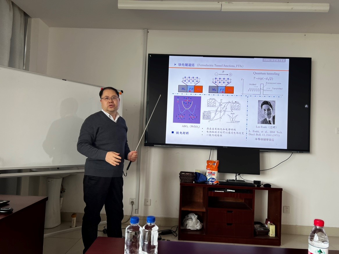 12月13日下午,南京林业大学郑小宏教授应邀来大米影视 开展题为“二维铁电隧道结的模拟设计”的学术报告。铁电隧道结是一类由铁电薄膜充当隧穿势垒的隧道结。伴随着外电场下铁电极化方向的反转,铁电势垒的高度或宽度将发生很大变化进而引起隧穿电阻的巨大变化,表现出巨电致电阻效应,这一效应使得铁电隧道结在非易失性存储器中具有重要的应用潜力,因而引起了人们的广泛关注。本场报告郑小宏老师首先用深入浅出的语言向参会的各位老师和学生介绍了铁电隧道结的研究背景以及所涉及到的半导体物理的基础知识和概念,随后着重介绍了他们小组近些年在二维铁电隧道结研究中取得的一些重要进展以及提出的一种基于组分材料功函数和带隙合理选择的二维铁电隧道结的可行设计方案。基于这样的设计方案,人们可以设计出性能优异的铁电隧道结,获得很高的隧穿电致电阻(TER)比率。大米影视 多名师生参加本次报告,认真聆听并积极提问。会后多位老师又与郑老师进行了深入探讨、交流以及商讨今后可能的合作机会。
