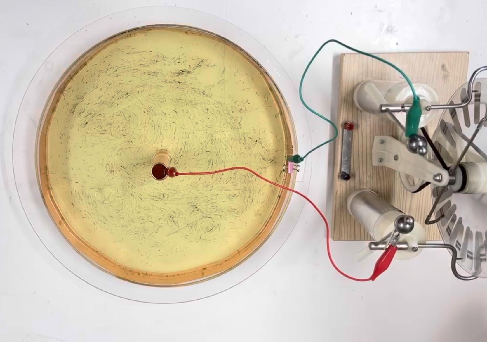 电场可视化仪用感应起电机对电极施加电压,产生静电场,以非导电物质(蓖麻油)为电场介质,放入可被极化的微物(棕榈),从而直观显现二维、三维电场分布。