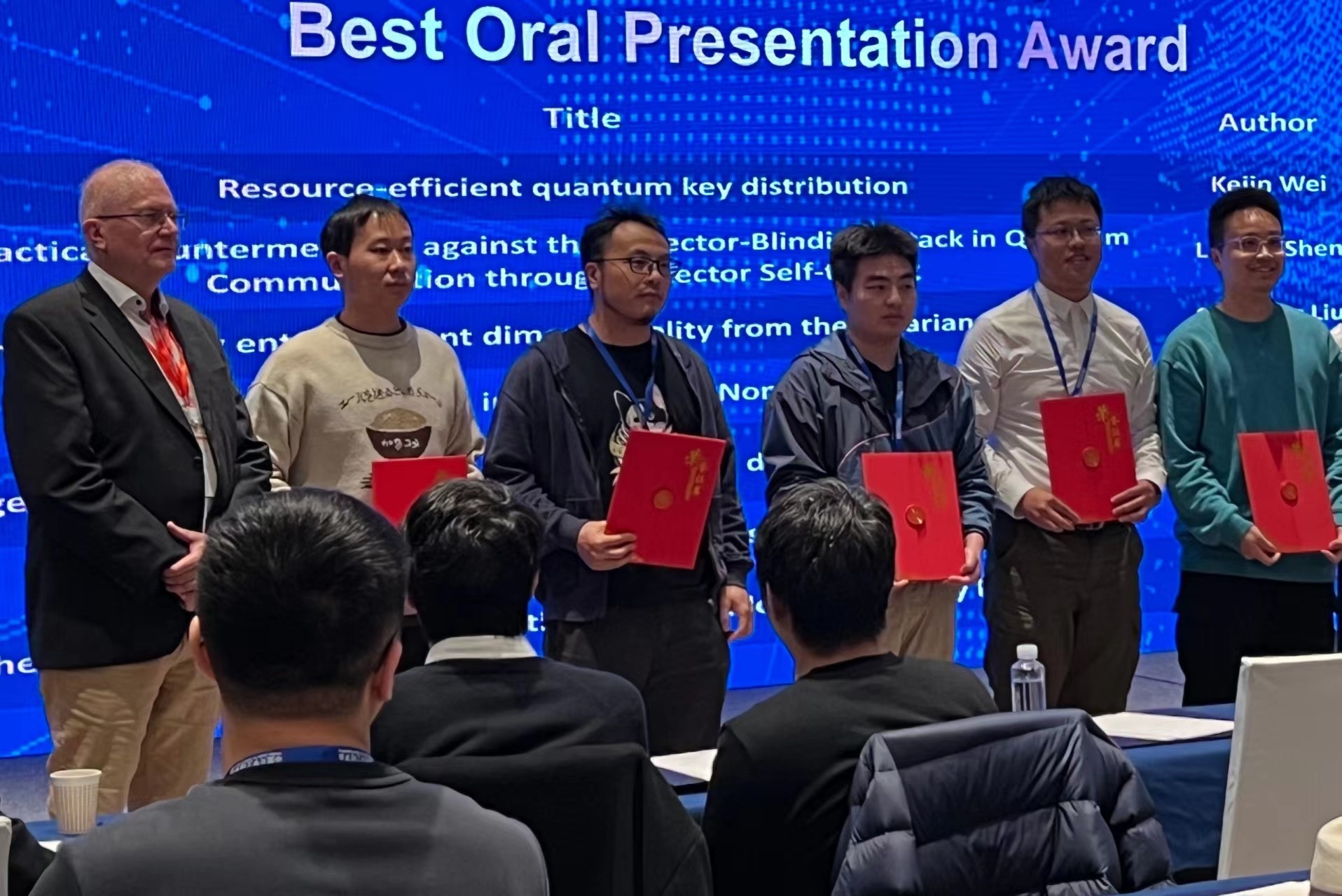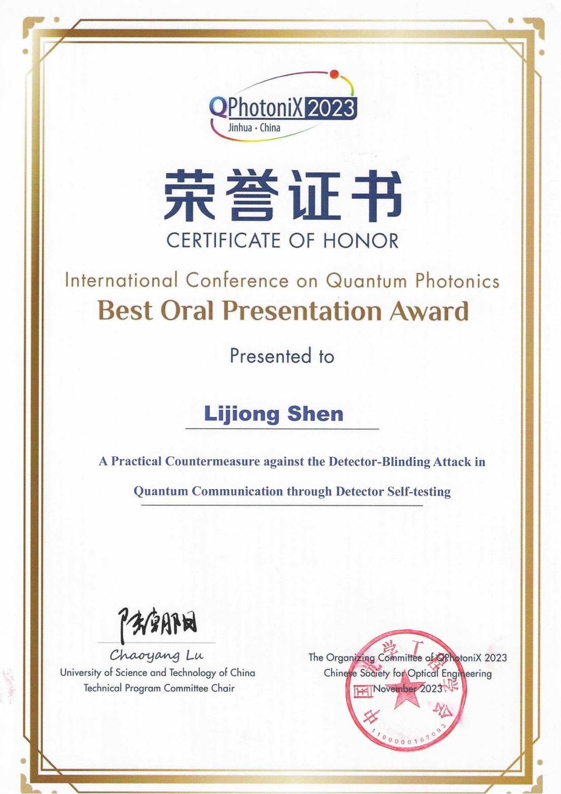 会议期间,共有600余位专家围绕量子光子学的各个方面进行了深入交流和探讨。在最佳口头报告奖的评选中,大米影视 专任教师沈李炯老师的报告《A Practical Countermeasure against the Detector-Blinding Attack in Quantum Communication through Detector Self-testing》脱颖而出,荣获最佳口头报告奖。沈李炯老师在报告中深入浅出地介绍了如何利用低成本和实用的方法抵御量子通讯中对探测器端的攻击,为量子通信的安全性提供了有力保障。