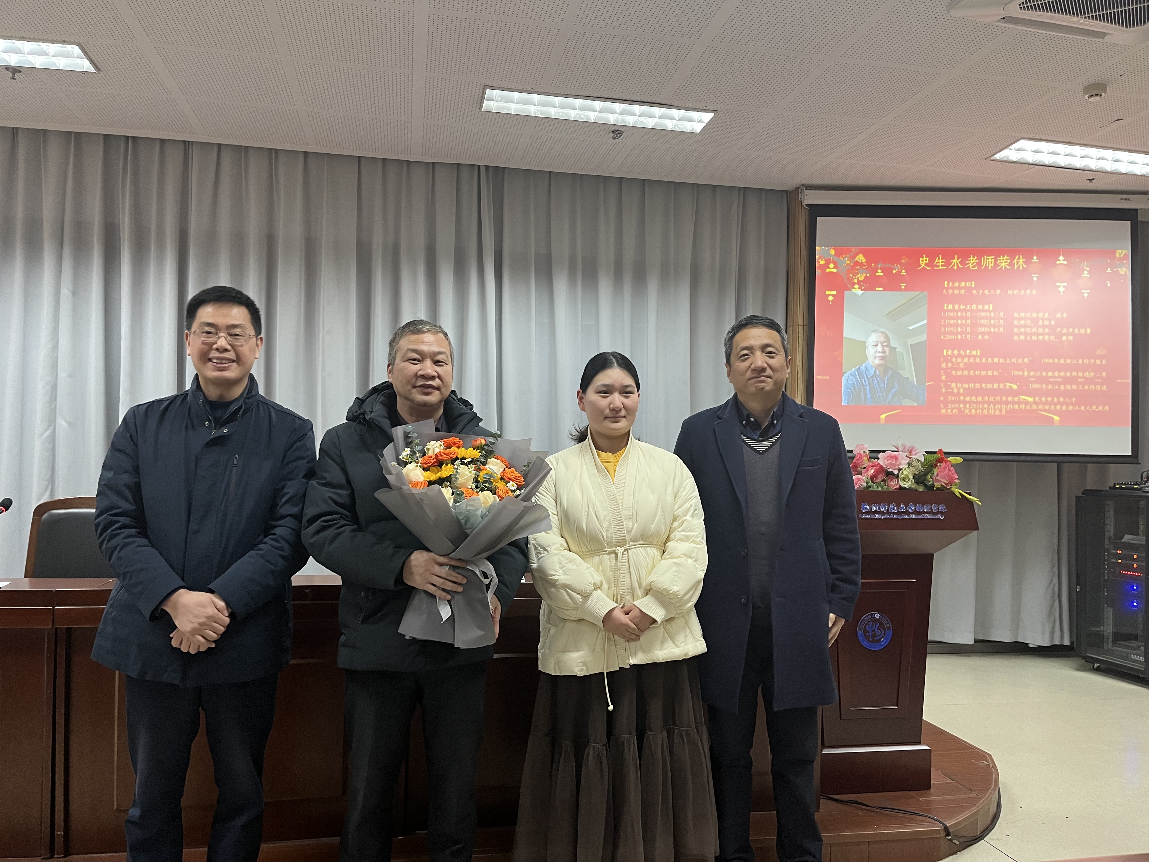 会上还举行了史生水老师荣休仪式,侯院长介绍了史生水老师的工作情况,感谢他工作35年来对学院建设发展的辛勤付出,青年教师代表向史生水老师献花,寓意青蓝相继、薪火相传。