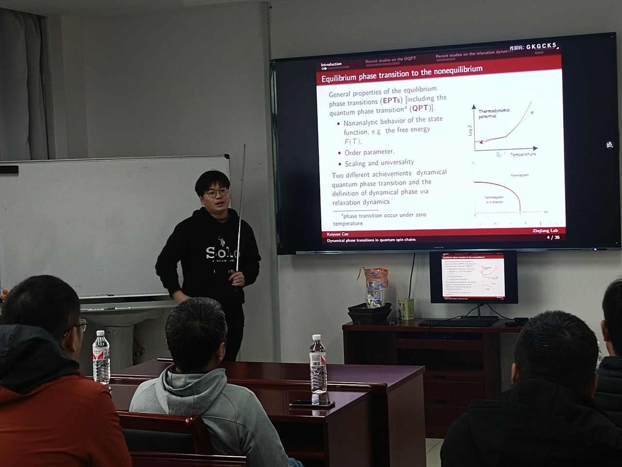 报告内容主要围绕量子自旋模型中的动力学相变展开。曹博士首先简要说明了平衡态相变和动力学相变之间的关系和区别。接着,他介绍了近年来量子自旋模型中的动力学相变研究的进展。基于这些研究基础,曹博士详细介绍了最近的一项研究成果:淬火后洛施密特回声在量子系统早期演化过程中存在非解析行为,该行为对应着动力学相变的现象。这项研究有助于更好地理解量子系统在非平衡状态下的动力学行为。接下来,曹博士讲述了另一项研究,即通过分析淬火后系统在长期演化过程中两点费米关联函数的松弛动力学行为,确定了动态相变两侧的不同标度行为。这一工作进一步揭示了量子系统中动力学相变的特性和机制。