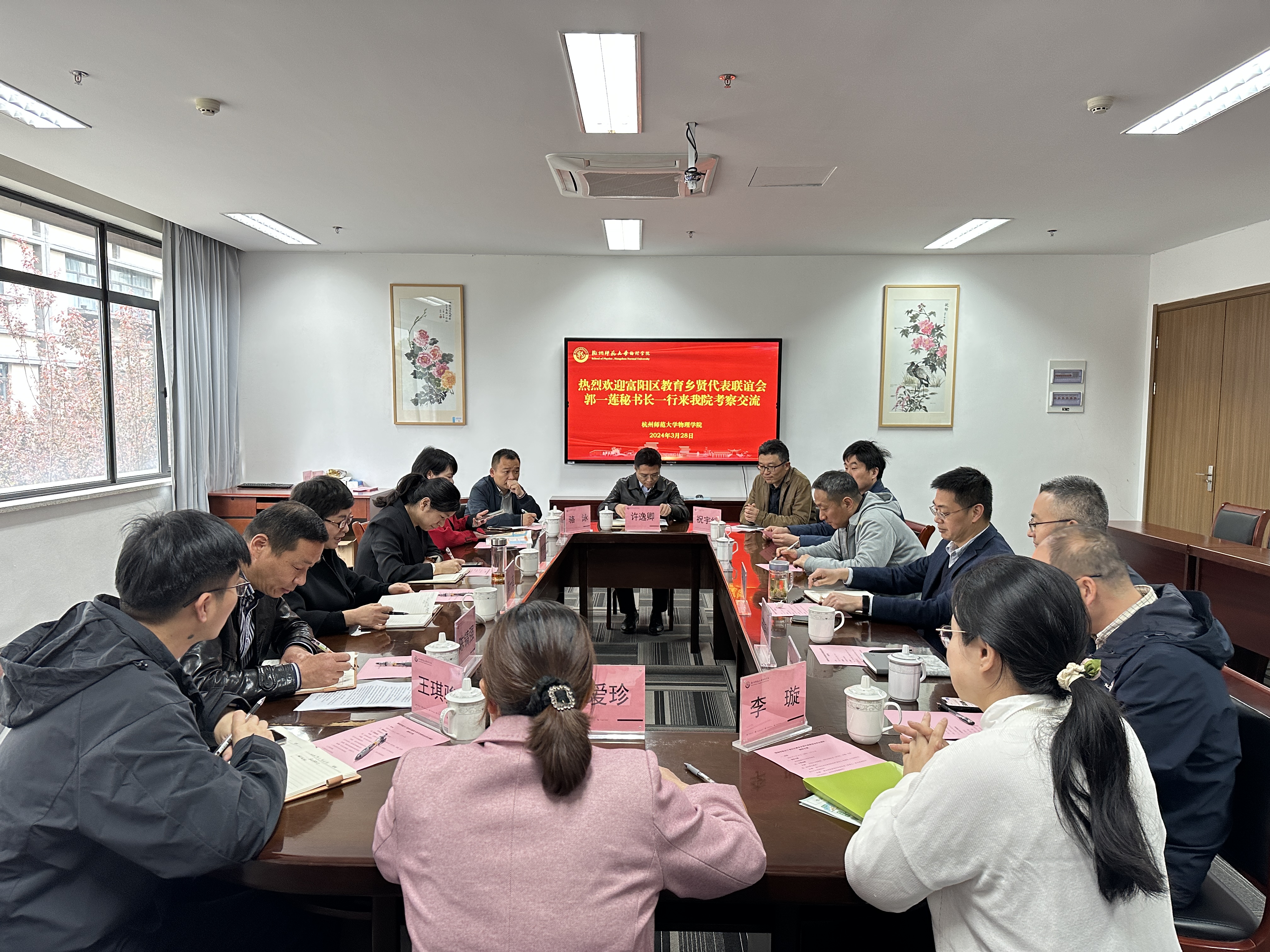 3月28日上午,富阳区教育乡贤代表联谊会秘书长郭一莲、副秘书长唐燕萍,郁达夫中学、富春四小等学校有关负责人一行8人来校调研“高校赋能中小学科学教育”,大米影视 党委书记何军参加调研,院长侯红生、院党委副书记苏晓松、院长助理李玉科等参加座谈。