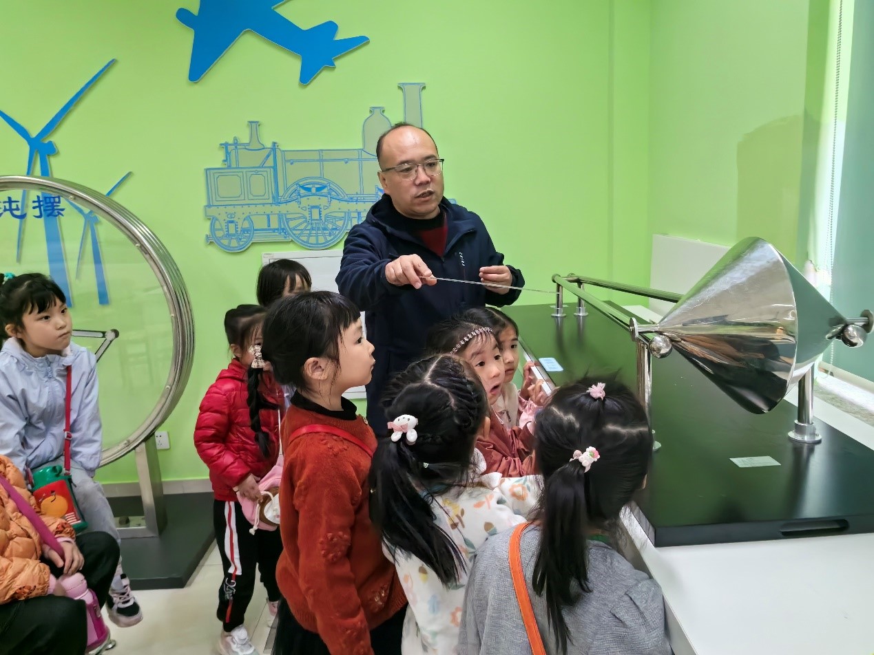 在力学与热学展厅,小朋友看到锥体上滚和听话的小球等现象时,脸上都现出了不可思议的表情。在老师的详细讲解下,恍然大悟的他们,又一个个露出了会心的微笑。在茹科夫斯基凳前,小朋友整整齐齐排好队,转啊转的,玩得不亦乐乎。