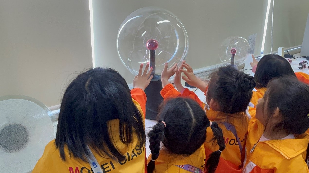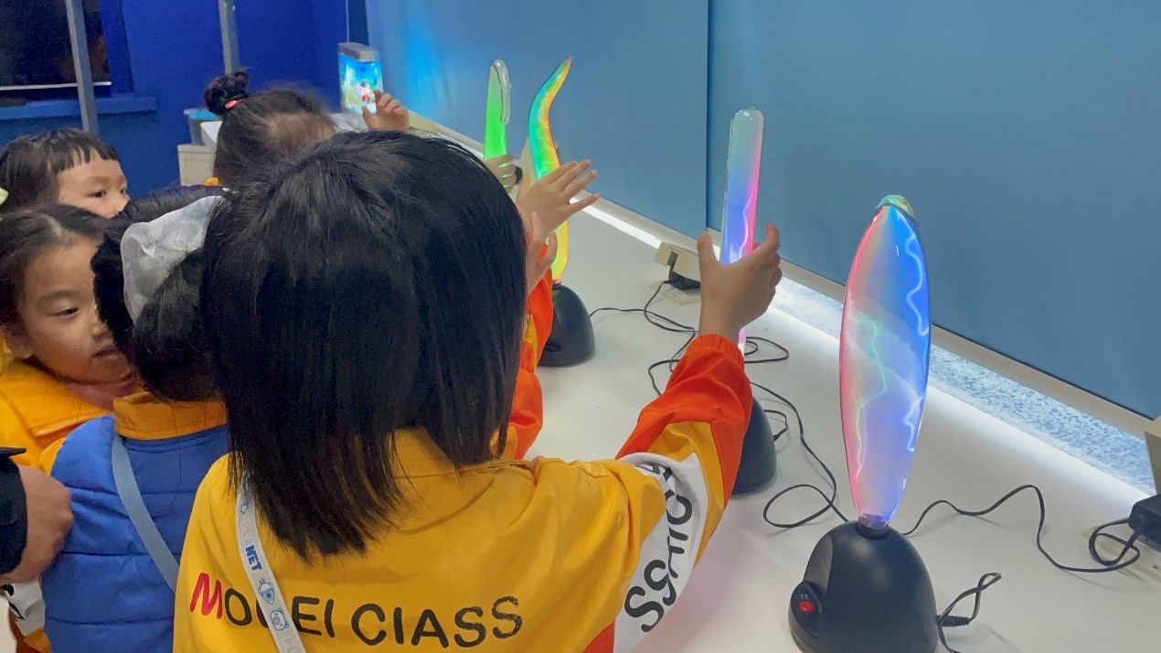 在电磁学展厅,看到五光十色、不停变幻的辉光球,小朋友们一个个都禁不住凑上去抚摸一下,感受引导电流游走的快乐。在高压静电球上,她们一个个地体验头发炸开的紧张和刺激。那一声声的惊呼,给整个实验室带了童真和欢乐的空气。