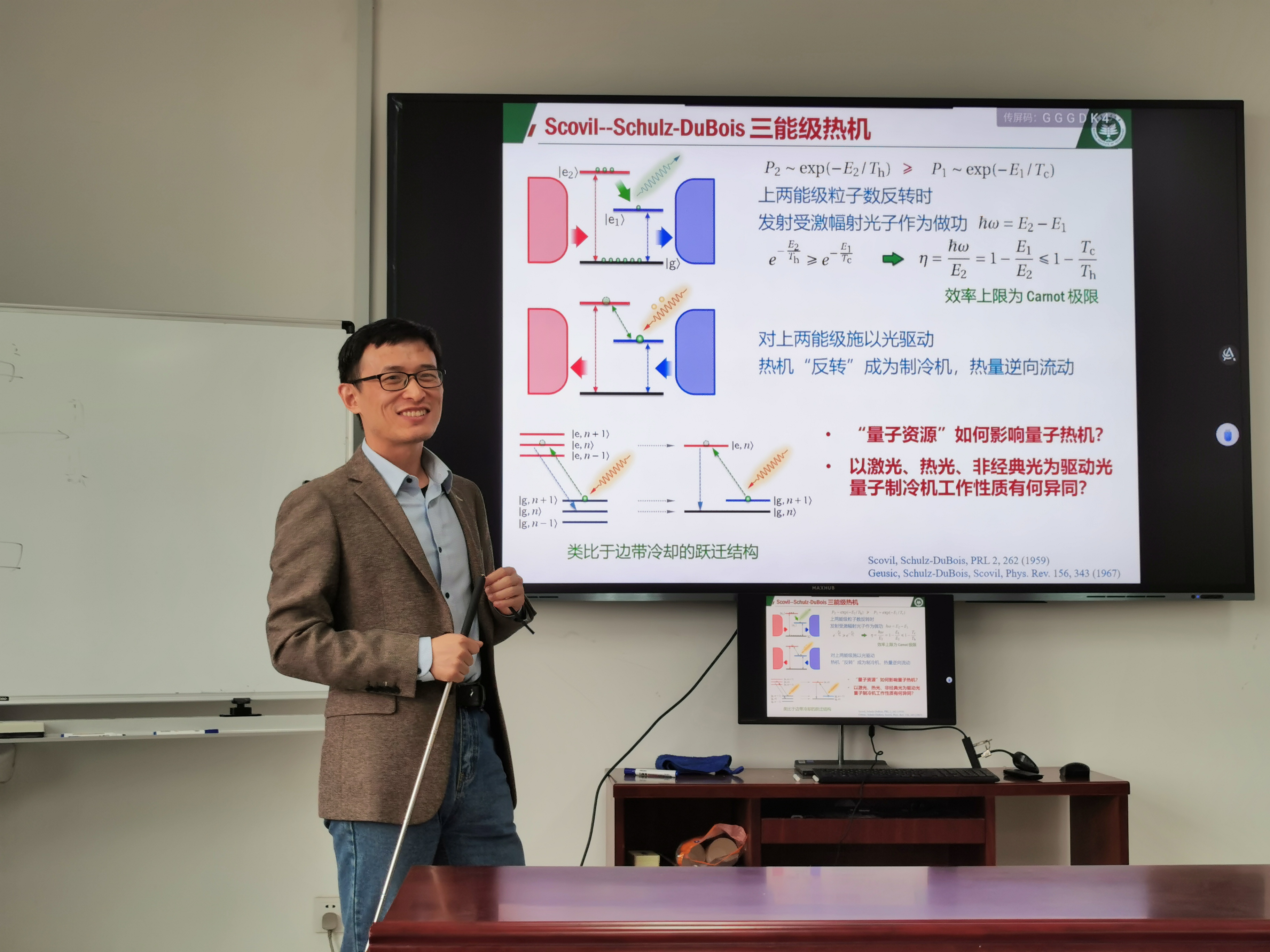 4月12日下午,北京理工大学李圣文副研究员应邀来大米影视 作题为“非经典光驱动的量子制冷机”的学术报告。非经典光在量子精密测量等领域有着广泛应用。报告中,李圣文研究员介绍了一个由多能级构成的量子制冷机,在驱动光作用下可驱使热量由低温热源流向高温热源。当分别以单模激光、热光、非经典反聚束光作为驱动光时,此量子制冷机产生的制冷功率在相同强度下,以激光作为驱动光时制冷功率最大。