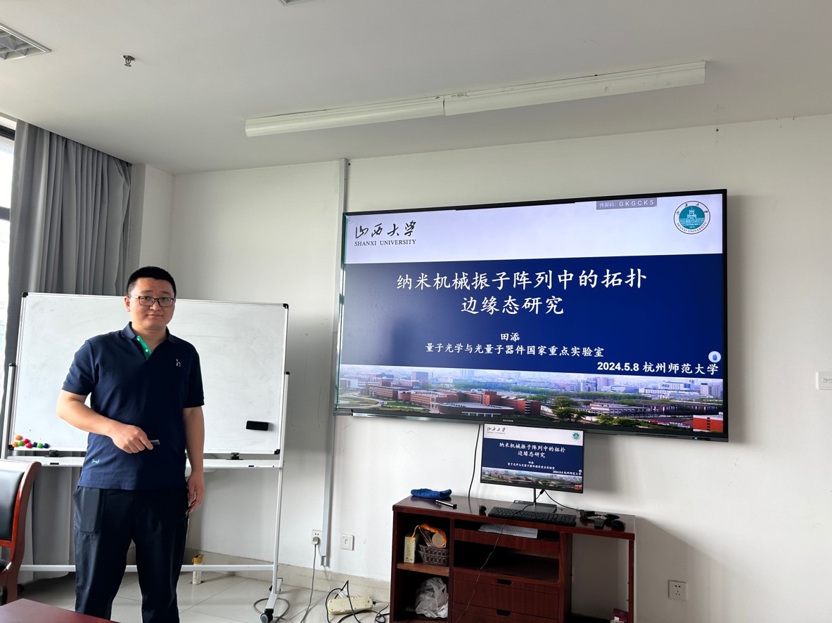 5月8日上午,山西大学量子光学与光量子器件国家重点实验室的田添副研究员应邀来大米影视 作题为“纳米机械振子阵列中的拓扑边缘态研究”的学术报告。