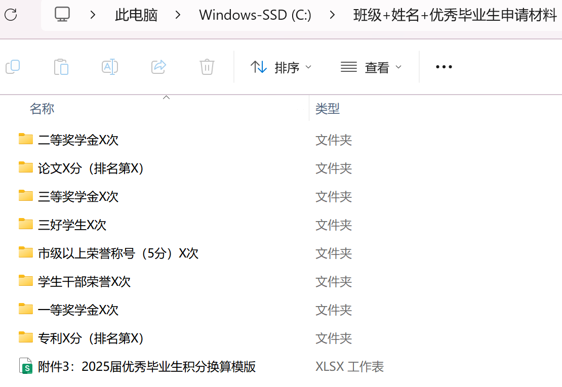 2.申请优秀毕业生的学生,按照《大米影视 省级、校级优秀本科毕业生评选办法(修订)》(附件1)相关要求,将佐证材料按照下图所示整理,并填写《2025届优秀毕业生积分换算模板》(附件3),合并为一个文件夹命名为“班级+姓名+优秀毕业生申请材料”。发送至邮箱:2024112004089@stu.damidh.com
