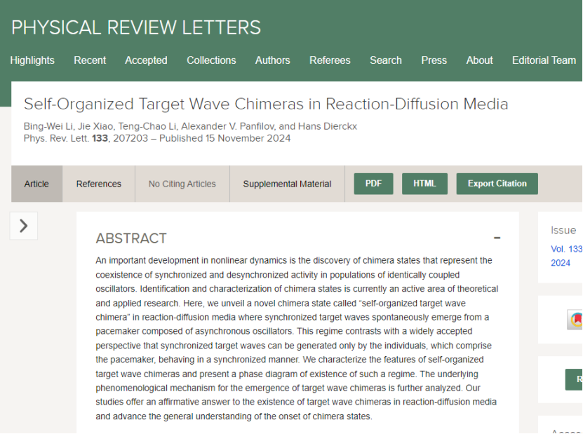 最近,统计物理与复杂系统李炳伟教授团队在一类振子与环境耦合的反应扩散系统中发现了一种新的奇美拉态——自组织靶波奇美拉态。不同于经典的靶波,自组织靶波奇美拉态的波源是由一组非同步的振子所构成。这个发现与传统观点认为源源不断的有序靶波是从同步振子构成的波源产生有很大不同。该工作进一步提出一个唯象模型予以解释,并给出了耦合强度和密度下靶波奇美拉态存在的相图。此外,研究团队在其他模型中也验证了这种自组织靶波奇美拉态的存在。此工作进一步加深了人们对靶波和奇美拉态涌现的理解。