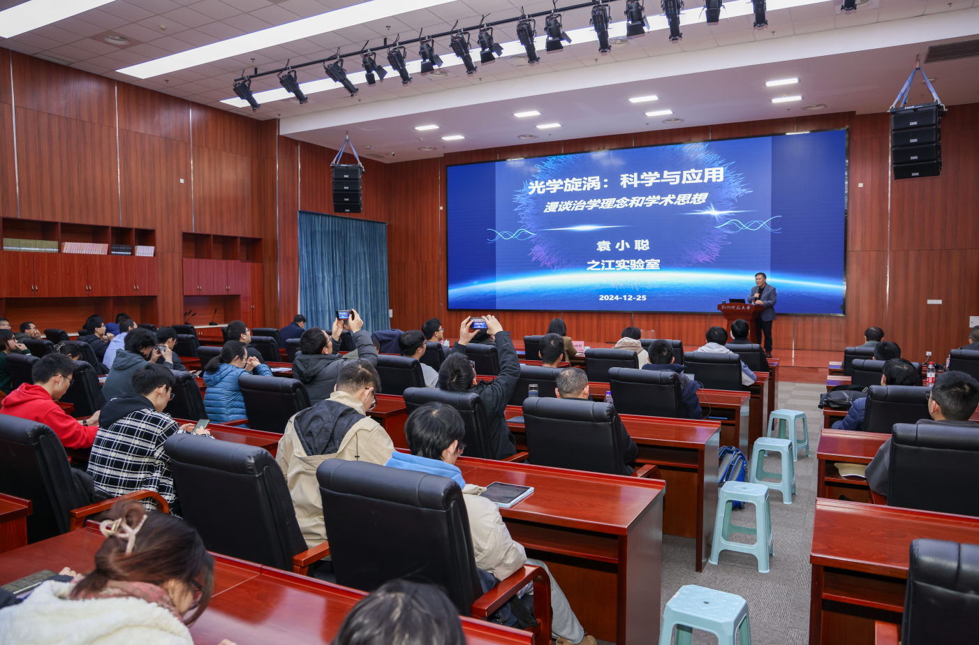 12月25日下午,“明远讲堂”第三十期在仓前校区勤思报告厅开讲。之江实验室前沿基础研究中心主任科学家、国家重大人才工程特聘教授、欧洲科学院院士袁小聪走进讲堂,与师生畅谈“光学旋涡:科学与应用——漫谈治学理念和学术思想”。袁小聪从黑洞、星系旋转以及龙卷风等现象出发,引入了光学旋涡的基本概念。他追溯了光子轨道角动量(OAM)的起源,并展示了两种典型的光学旋涡——轨道角动量光束和圆柱矢量光束,两者均包含光学奇点。袁小聪深入浅出地阐述了光学旋涡在光学操控和光通信等领域的广泛应用前景之后,特别提及了研究团队的一项创新成果——新型聚焦表面等离激元光镊,并详细探讨了这一光镊在拉曼信号增强中的物理机制。