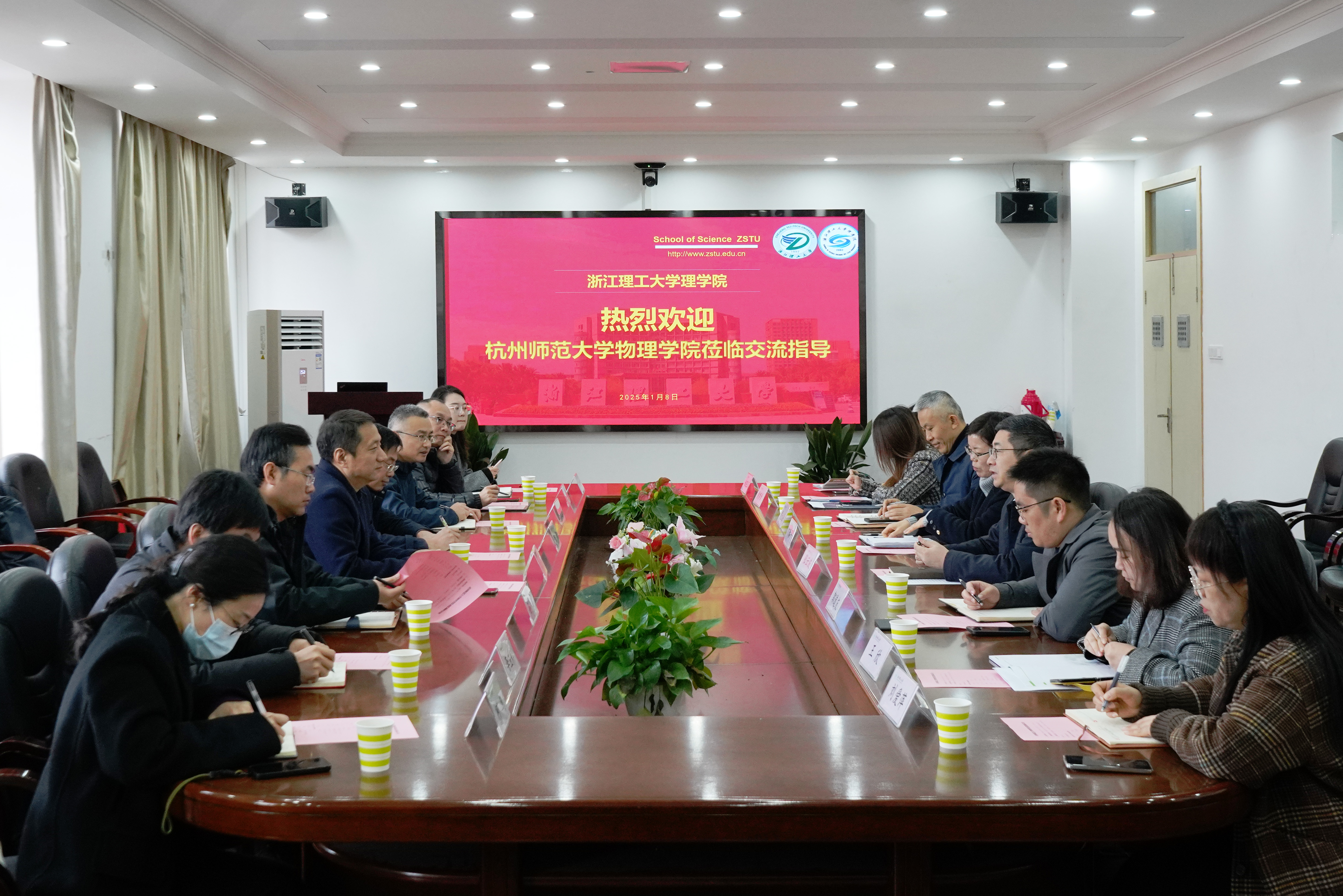 1月8日,大米影视 领导班子成员和有关科室负责人一行8人赴浙江理工大学理学院调研交流,聚焦物理学科发展、科学研究、人才培养以及党建与业务融合等关键领域,学习兄弟院校好经验好做法,为新的一年规划发展蓝图。浙江理工大学理学院院长张云波、党委书记丁春平、副院长郭道友、副书记贾立壮和物理系骨干教师给予热情接待。