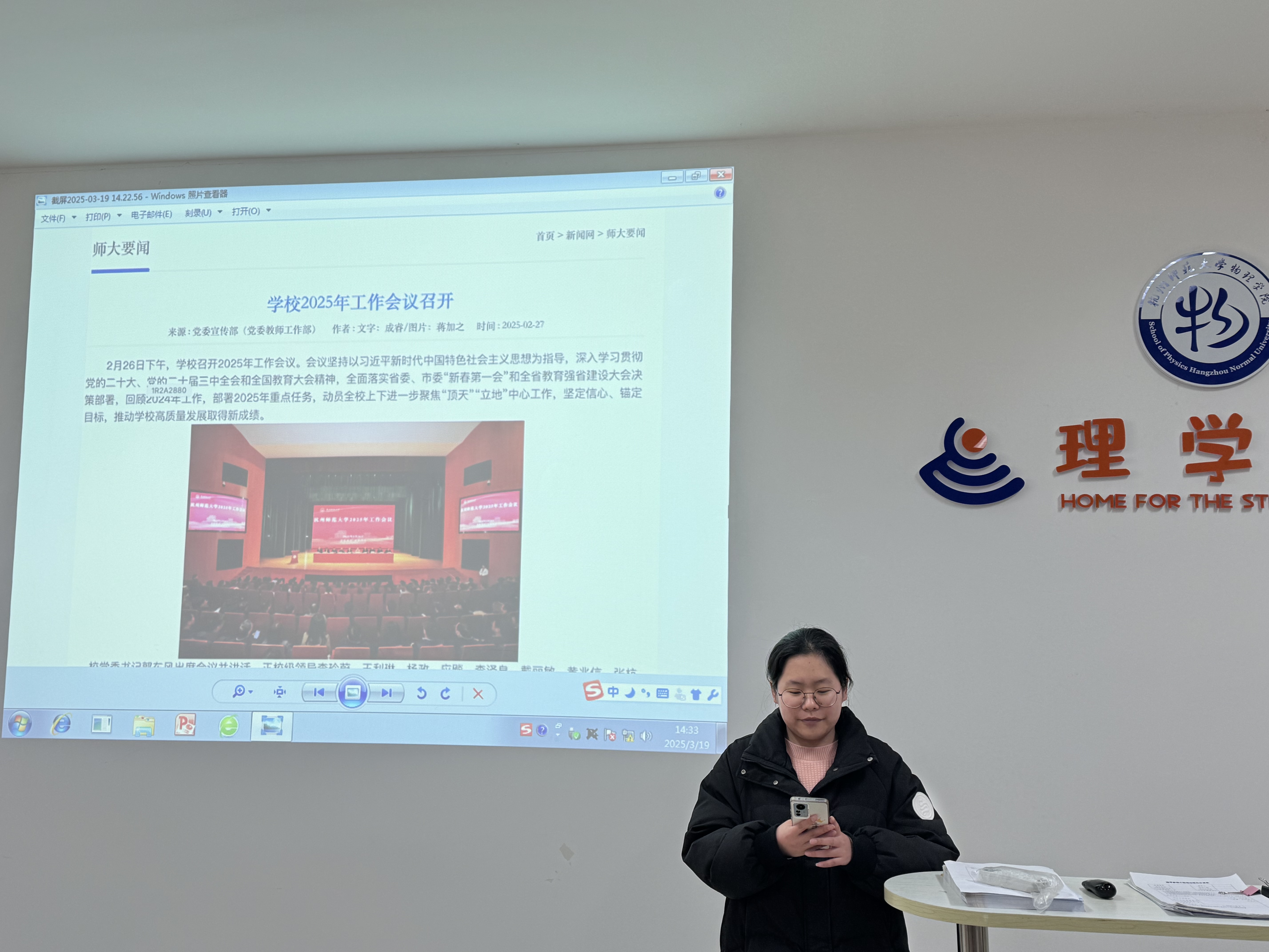 方雯分享其学习学校2025年工作会议心得,该会议强调学校2025年工作要坚持围绕“中心抓党建,抓好党建促发展”,深入实施“培根铸魂强基”工程,持续“深化狠抓落实年”和“能力提升年”主题活动,大力弘扬六干精神,强化理论武装,把牢干的方向加强能力建设,提升干的本领。
