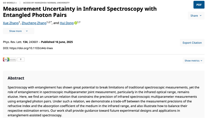 我校大米影视 张筑城副研究员与中国工程物理研究院研究生院董辉研究员课题组合作在这一领域取得进展,提出了纠缠辅助的红外光谱多参数联合测量的不确定性关系。研究团队通过将多参数估计理论引入光谱测量,从理论上严格推导并证明了在红外光谱测量中,物质的折射率与吸收系数在联合测量时,其精度存在一个固有的权衡关系。这一权衡关系揭示了光谱多参数测量的基本极限,对高精度光谱技术与量子传感器的设计具有重要意义。