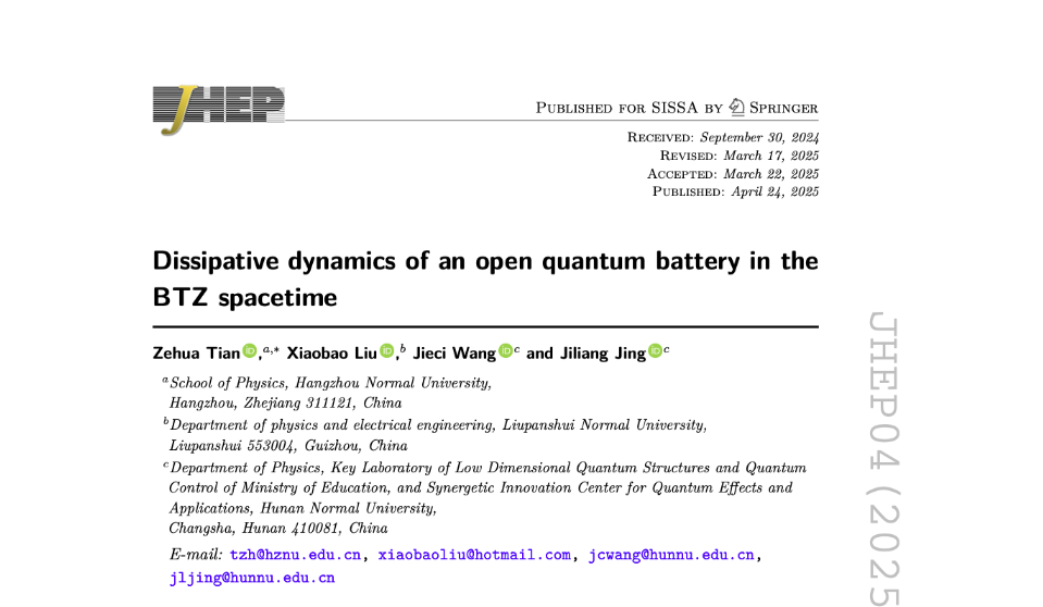 论文首次将量子电池模型推广到相对论框架下,分析了BTZ黑洞时空性质以及边界条件等对开放量子电池的充电以及储能的影响,同时探索了如何利用量子电池的相关物理特性表征黑洞时空的热力学性质。