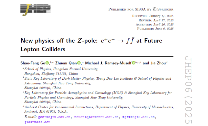 近日,大米影视 钱卓妮副教授及其合作者在国际高能物理重要学术期刊《Journal of High Energy Physics》(JHEP)上发表了题为 "Complementary constraints on Zbb couplings at the LHC" 的研究论文(2025年6月,DOI: 10.1007/JHEP06(2025)067)。该研究聚焦未来正负电子对撞机(如CEPC、FCC-ee和ILC)在Z玻色子共振峰处的精确测量,探索标准模型之外的新物理(NP)。
