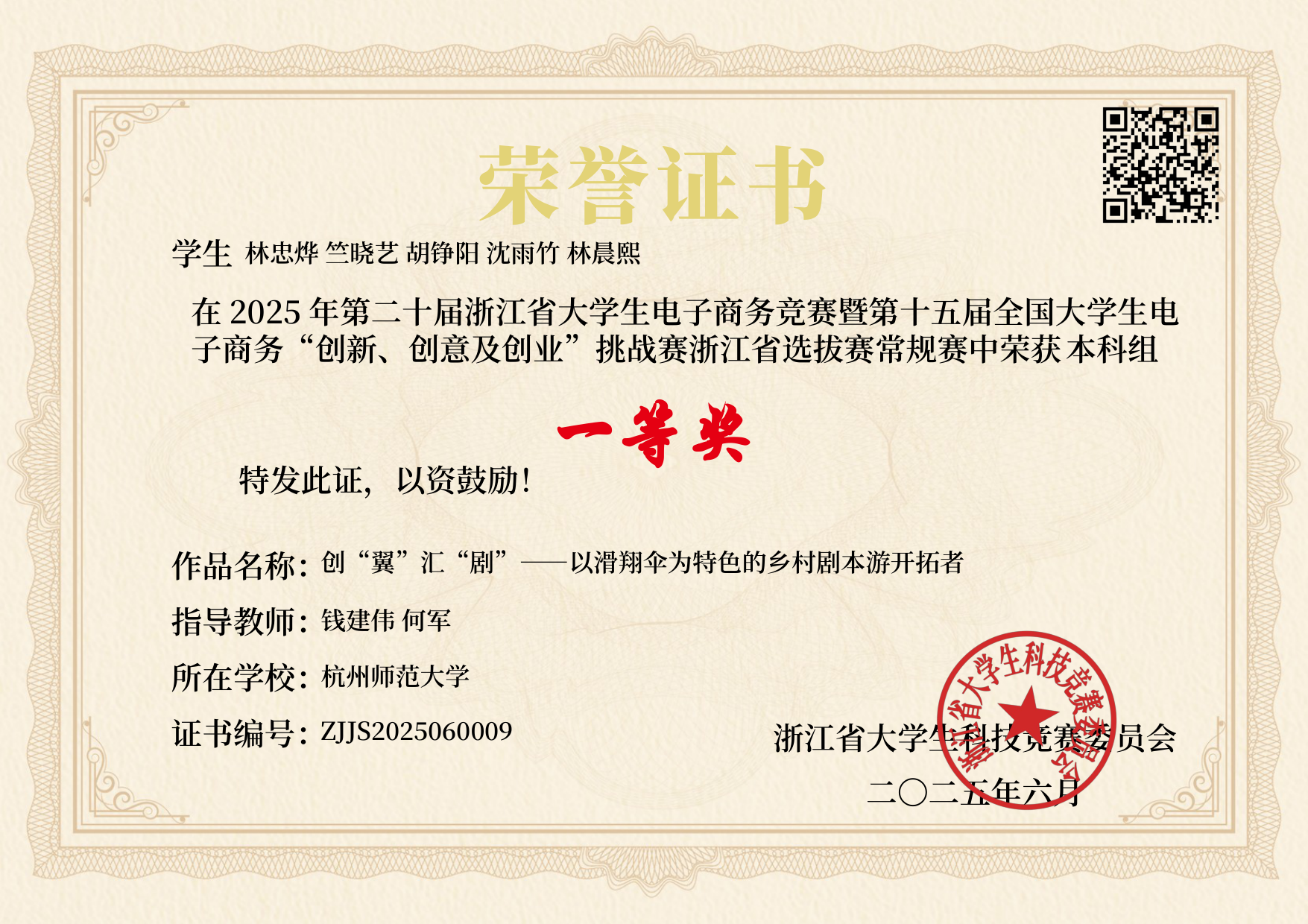 近日,第二十届浙江省大学生电子商务竞赛暨第十五届全国大学生电子商务“创新、创意及创业”挑战赛常规赛浙江省选拔赛在浙江工商大学圆满收官。本届赛事共吸引全省96所高校的3410支团队同台竞技,其中仅有96支团队获得一等奖。由大米影视 物理本硕221班林忠烨、阿里巴巴商学院竺晓艺、人文学院胡铮阳、沈雨竹、林晨熙组成的团队喜获省赛最高奖——一等奖。