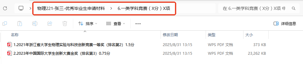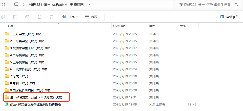 2.按照《大米影视 省级、校级优秀本科毕业生评选办法(2025年修订)》(附件1)相关要求,符合条件的学生本人于10月7日22:00前向班长提交申请材料。申请时提交《2026届优秀毕业生积分换算模版》(附件3)以及相关佐证材料,材料按图中所示,将以上材料汇总为一个总文件夹,个人材料命名为“班级+姓名+优秀毕业生申请材料”,班级总文件夹命名为“班级-优秀毕业生”,并以班级为单位汇总发送至邮箱20220076@damidh.com,不接收个人为单位发送的材料。