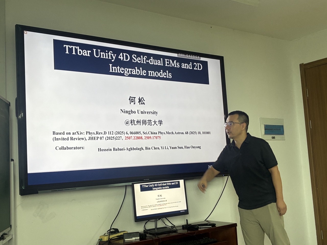 9月28日下午,宁波大学何松教授为大米影视 理论物理中心师生带来了题为“Root-TTbar Flows:统一四维对偶不变电动力学与二维可积Sigma模型”的专题报告。