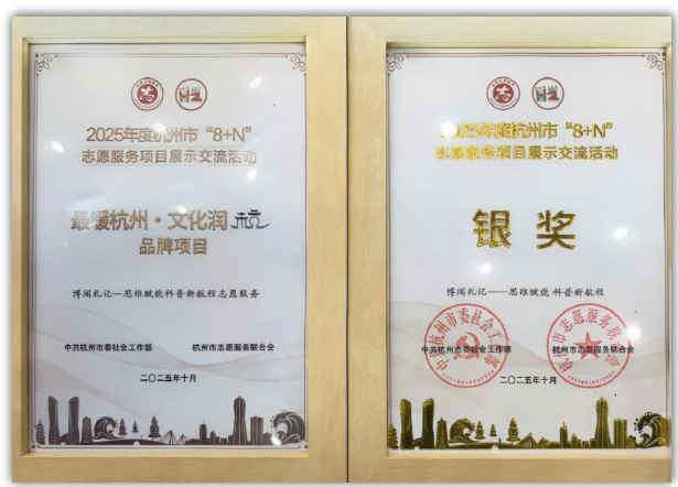 10月30日,由中共杭州市委社会工作部主办的“最暖杭州 志愿同行”杭州市“8+N”志愿服务项目展示交流活动品牌发布仪式举行。大米影视 李璇老师指导的“博闻札记——思维赋能科普新航程”项目经多轮评审,从全市80余个优秀项目中脱颖而出,荣获银奖并入选市级志愿服务品牌项目。