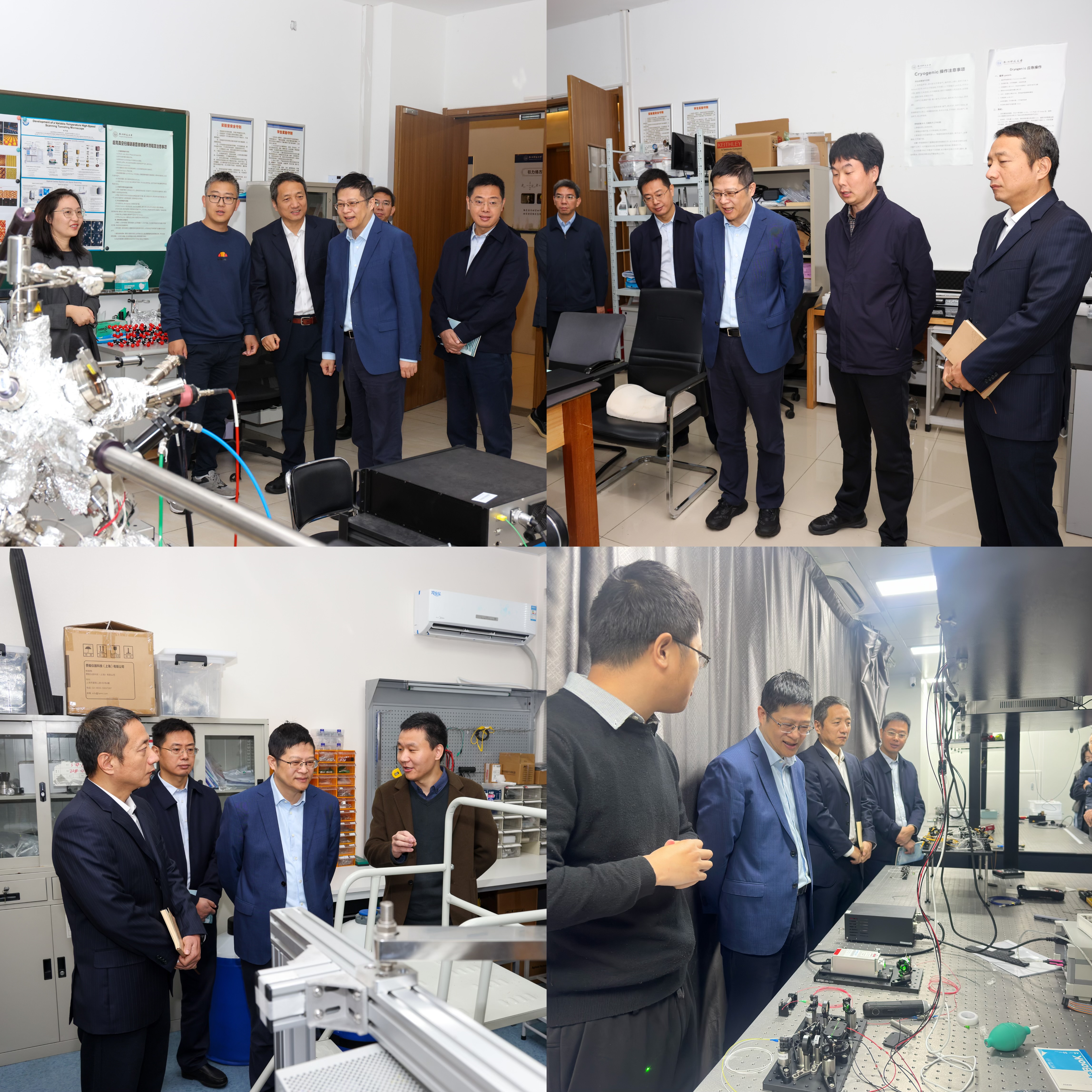 会前,唐校长一行实地考察了超高真空变温扫描隧道显微镜实验室、极端条件热电输运实验室、超高真空红外光谱实验室、量子通信与精密测量实验室等四个科研实验室。唐校长认真观察了实验设备的使用情况,与正在忙碌的教师们亲切交流,了解科研项目的研究方向、进展情况以及遇到的困难。杨泽超教授、李玉科教授、钟建强教授、沈李炯副教授热情地向唐校长介绍了自己的科研成果,分享了在研究过程中的创新思路和突破点。唐校长对教师们的科研工作给予了充分肯定,鼓励他们继续保持创新精神,勇于探索未知领域,为学校的科研事业做出更大贡献。