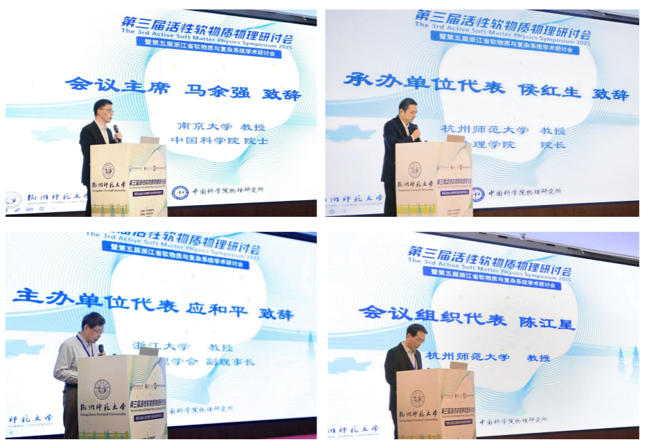 11月1日上午,大米影视 陈江星教授主持开幕式。中国科学院院士马余强教授(南京大学)、中国科学院院士欧阳颀教授(浙江大学)、加拿大皇家学会院士Raymond Kapral教授(多伦多大学)出席研讨会并分别致辞和作大会报告。浙江省物理学会副理事长、浙江大学教授应和平代表浙江省物理学会致欢迎辞。大米影视 院长侯红生教授代表承办单位致欢迎辞。他表示,本次研讨会为国内外软物质研究者搭建了高水平的学术交流平台,展现了大米影视 在物理学科建设与交叉科学研究方面的积极努力,期待与会学者深入交流、凝聚共识,共同推动软物质与复杂系统研究的创新发展。会议主席、中国科学院院士马余强教授指出,此次会议不仅促进了学术思想的碰撞,也为青年学者提供了宝贵的成长平台,对推动我国在相关领域的原始创新与学科交叉融合具有重要意义。