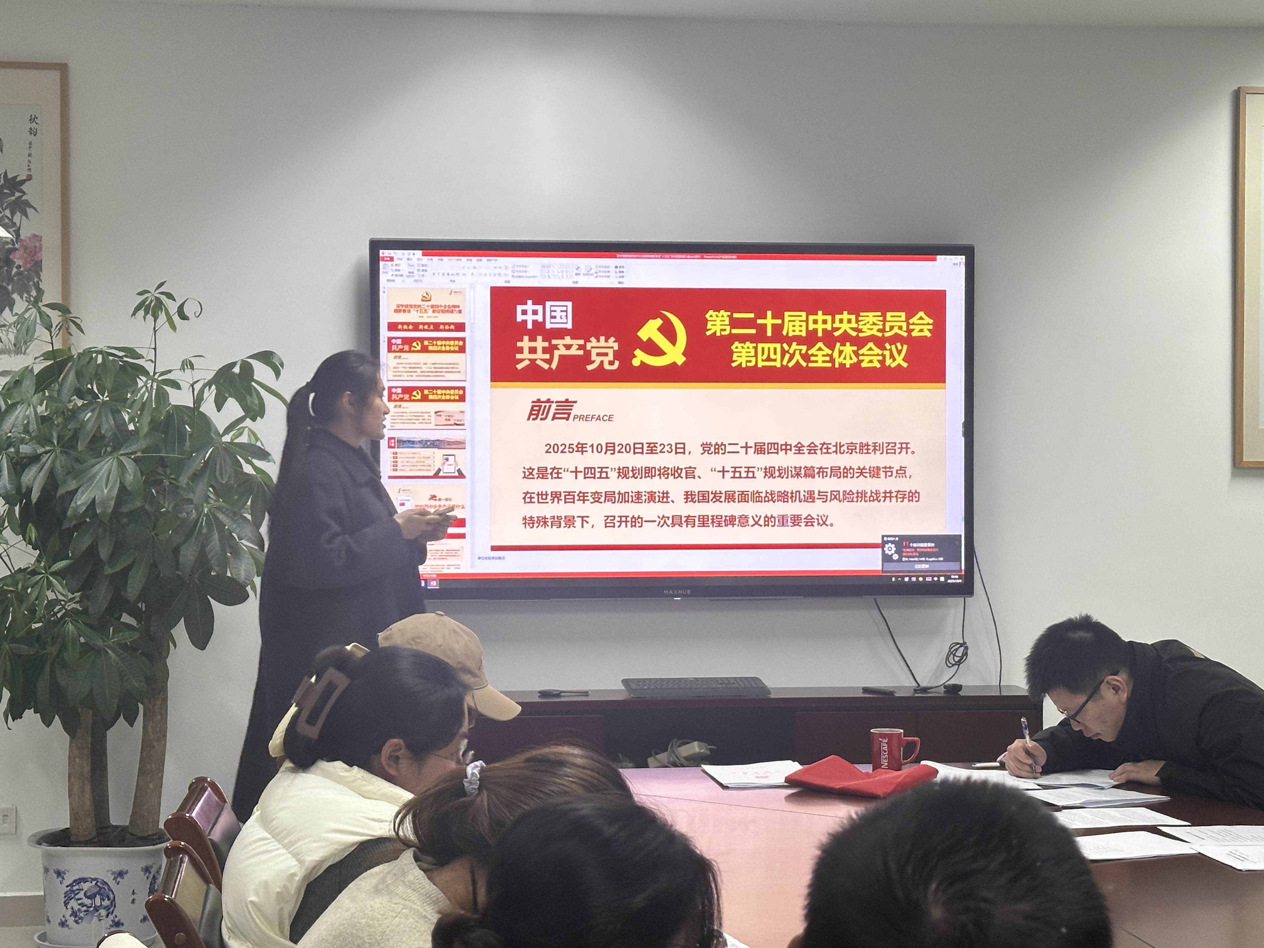 第三项议程是党日活动,陈黎颖和马艺飒两位同学以“学习贯彻党的二十届四中全会精神”为主题,分享他们学习党的二十届四中全会精神的心得体会,全会吹响了“十五五”时期奋进的号角,我们要积极响应全会号召,牢记“六个坚持”重要原则,凝心聚力、奋发进取。以推动高质量发展为主题,以满足人民日益增长的美好生活需要为根本目的,向着高质量发展取得显著成效、科技自立自强水平大幅提高等“十五五”主要目标勇毅前行,为确保基本实现社会主义现代化取得决定性进展,为全面建成社会主义现代化强国、实现第二个百年奋斗目标,以中国式现代化全面推进中华民族伟大复兴而努力奋斗!