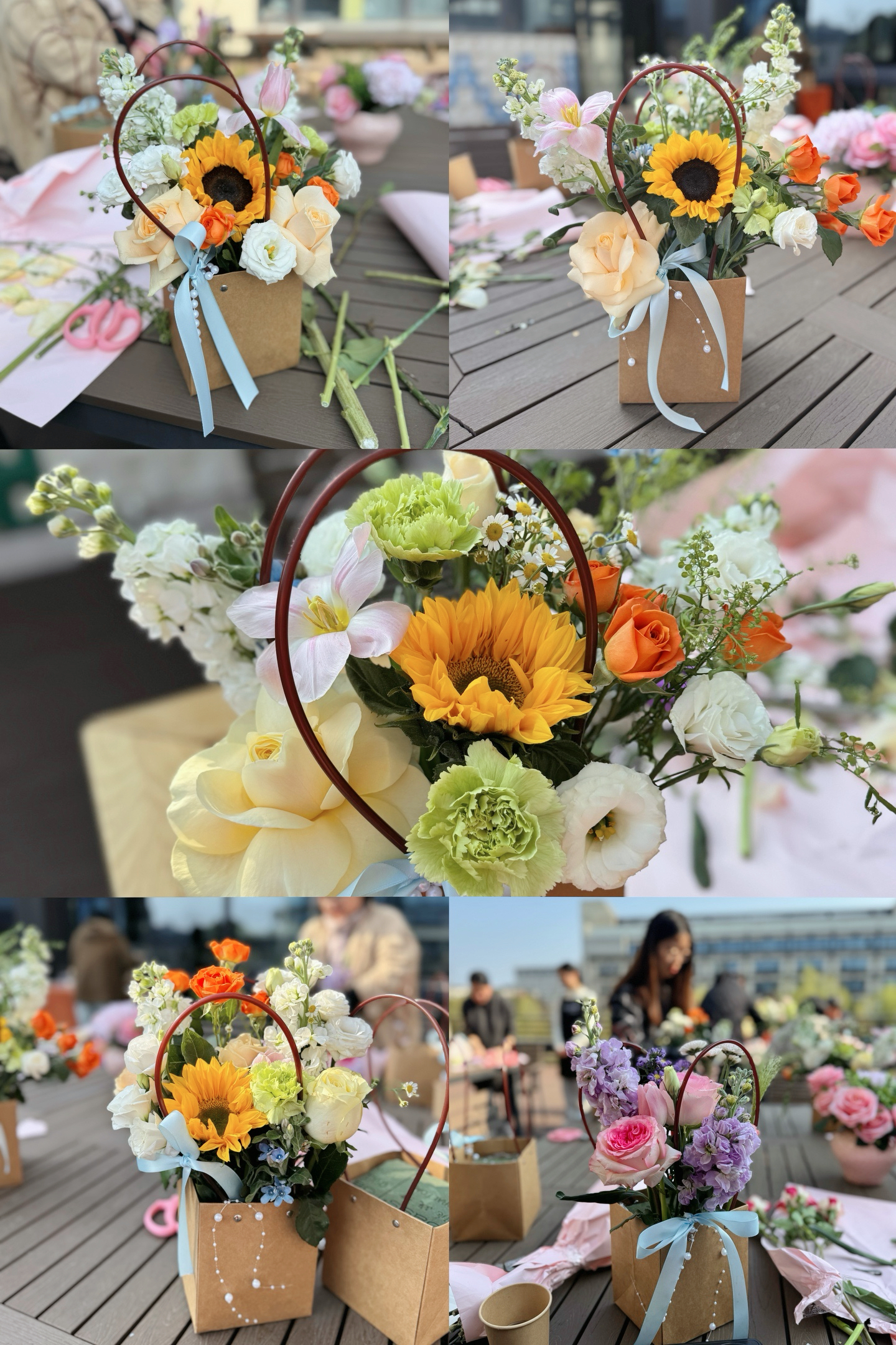 活动现场,露台上春意盎然,玫瑰、康乃馨、洋桔梗等鲜花整齐摆放,花香四溢。花艺老师从花材识别、色彩搭配到修剪技巧、造型设计进行了细致讲解。女教师们认真聆听,随后迫不及待地动手实践。她们发挥创造力,用心构思、精心搭配,将一朵朵鲜花错落有致地插入花篮。普通的花草经过巧手修剪,变成了一件件独具匠心的花艺作品。