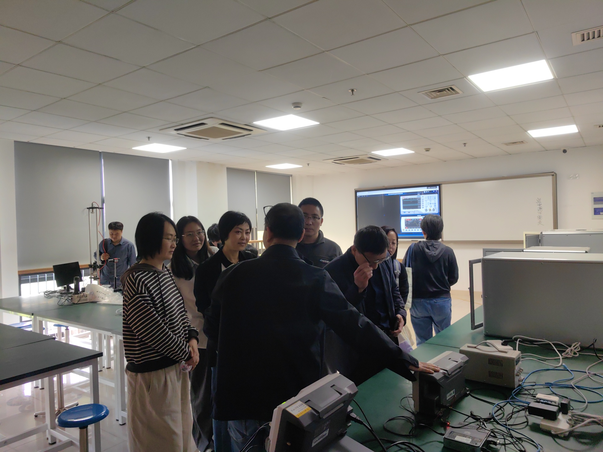 4月8日下午,大米影视 组织13名教师前往浙江工业大学物理国家级实验教学示范中心考察交流。浙工大实验中心主任刘凡新教授、陈钢教授热情接待了学院教师一行,并陪同参观了基础物理实验室和AI实验室。
